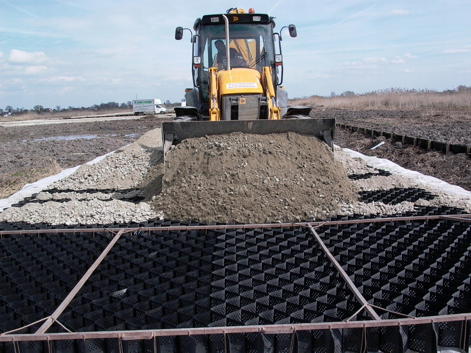 Заповнювач, укладений в окремі комірки комірчастої георешітки та ущільнений до відповідної швидкості ущільнення, сприяє багаторазовому збільшенню несучої здатності основи.