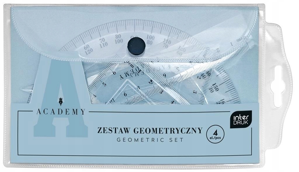 Геометричний встановлений у практичному випадку, що дозволяє безпечне зберігання та перенесення. Включає 4 елементи: 15 см правителя, точилка, прямокутна екологічна та кут.