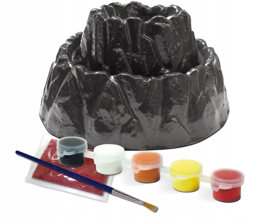 Набір містить чорний вулкан, який потрібно зібрати з двох елементів, потім розфарбуйте його фарбами з набору, які бувають п'яти кольорів, які підходять для цієї мети: чорний, білий, червоний, жовтий і оранжевий. Вулканічні кольори ми переносимо на основу, яка з часом набуває кольорів лави та чорної магми, на розсуд маленького геолога. Спеціальний вулканічний пил ідеально завершує «вулканічну роботу» і робить вулкан справді чудовим.