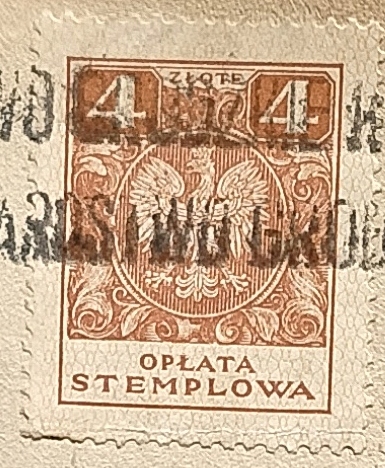 Марка погашеного збору номіналом 4 PLN світло-коричневого кольору. Формат 2,5х3,2 см, стан хороший. [ ДОХОД ] [ Друга Польська Республіка ] ] 210Є
