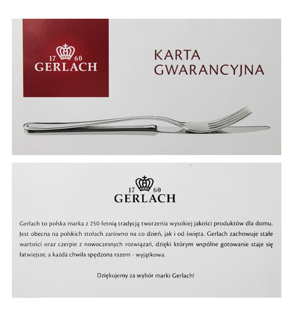 Польський бренд Gerlach - це традиція, яка досягає понад 250 років. Мейнтен Філіп Санівський, а згодом Семюел Герлах і розроблений братами Коблейнського, він здобуває репутацію та велике визнання на ринку металевих продуктів. Один з перших продуктів, завдяки їх надзвичайній якості, оцінив навіть Цар Ніколас I, який дозволив підписати бренд із символом корони, присутнім у логотипі компанії до сьогодні. Сьогодні Герлах -це динамічно розвивається підприємство, використовуючи сучасні рішення, побудовані за століттями.