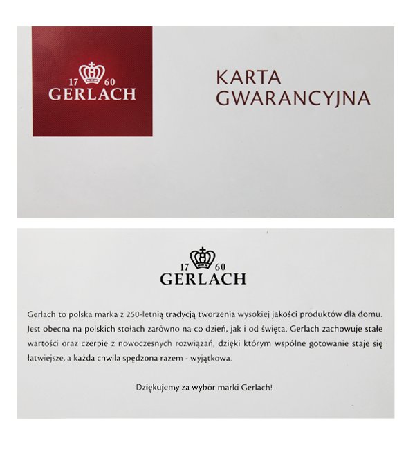 Польський бренд Gerlach - це традиція, яка досягає понад 250 років. Мейнтен Філіп Санівський, а згодом Семюел Герлах і розроблений братами Коблейнського, він здобуває репутацію та велике визнання на ринку металевих продуктів. Один з перших продуктів, завдяки їх надзвичайній якості, оцінив навіть Цар Ніколас I, який дозволив підписати бренд із символом корони, присутнім у логотипі компанії до сьогодні. Сьогодні Герлах -це динамічно розвивається підприємство, використовуючи сучасні рішення, побудовані за століттями.