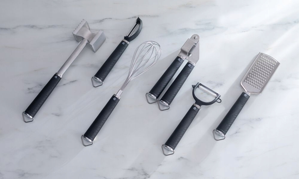 аксесуари Forte елегантні , а також практичні інструменти для щоденних кухонних завдань. Високоякісна сталь та здоров'я -SAFE PA66 Пластик, що використовується для їх виробництва, характеризується високою міцністю, що одночасно перетворюється на довговічність аксесуарів. Крім того, для більшого комфорту використання ручки були обладнані приємним на дотик м'якого дотику , що в поєднанні з ергономічними показниками забезпечує найвищу зручність використання. Кожен з інструментів також має практичні, металеві підвіски , завдяки якому пристрої завжди можуть бути під рукою. Аксесуари можна очистити легко та ефективно , але їх також можна промивати в механічних посудомийних машинах .