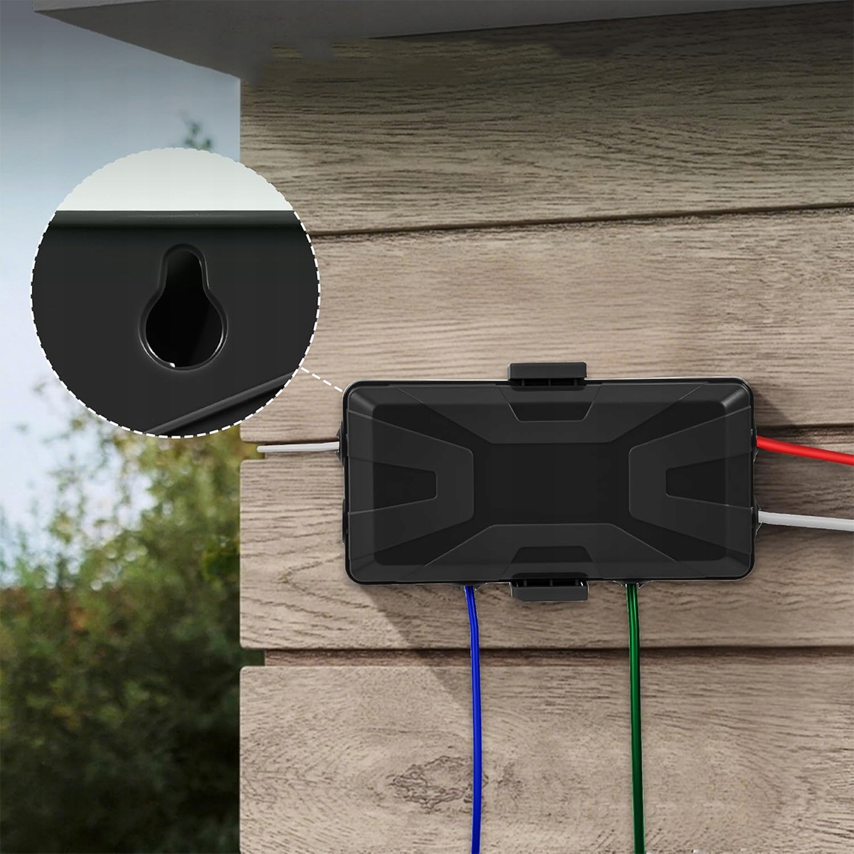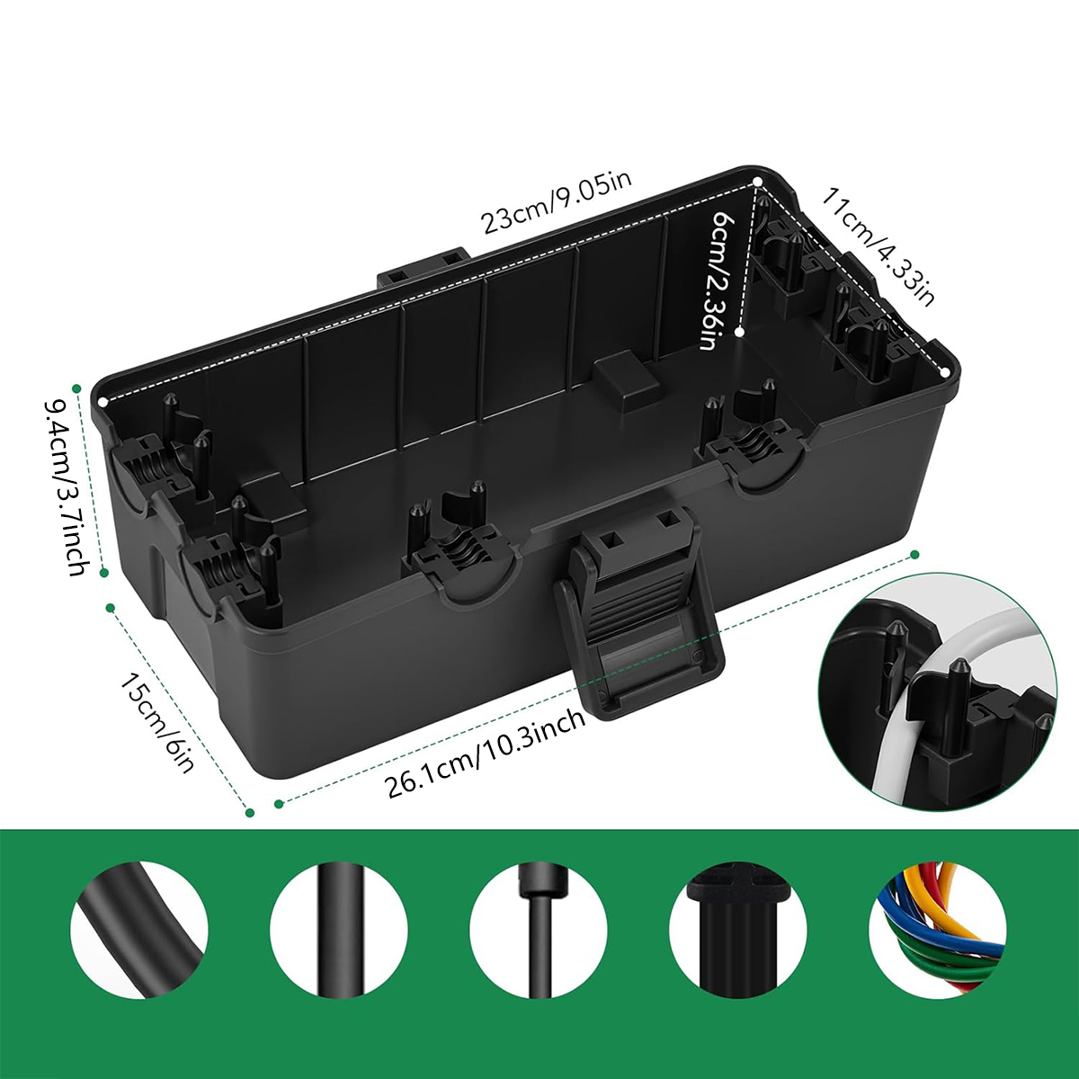 Водонепроникна кабельна коробка виготовлена з міцного поліпропіленового матеріалу та захищає вилки та зовнішні з’єднання від ураження електричним струмом. Внутрішні гаки забезпечують натяг кабелю і стабільність з'єднання. (Примітка. Наша коробка вміщує лише 4-5 штекерів; перед покупкою уважно перевірте розмір штекера!)