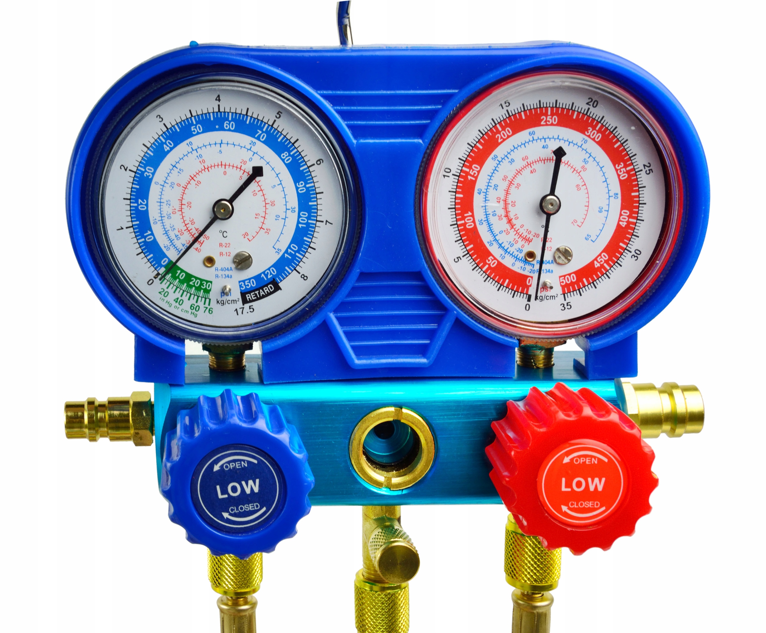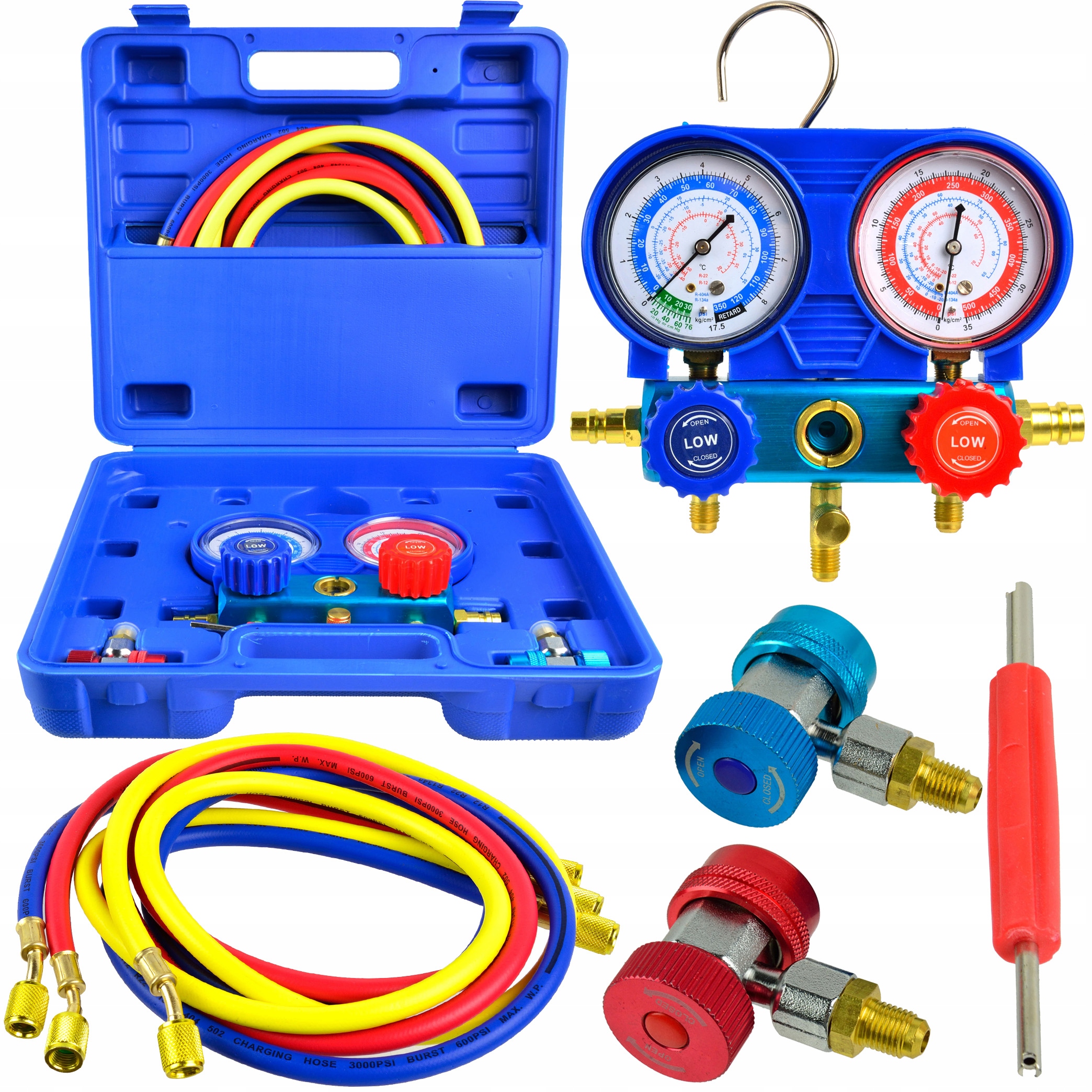 Набір манометрів для автомобільного та стаціонарного кондиціонера для холодоагентів R407C, R404A та R134A з комплектом 3 шлангів довжиною 150 см та швидкісних з’єднань для автомобільного кондиціонера.