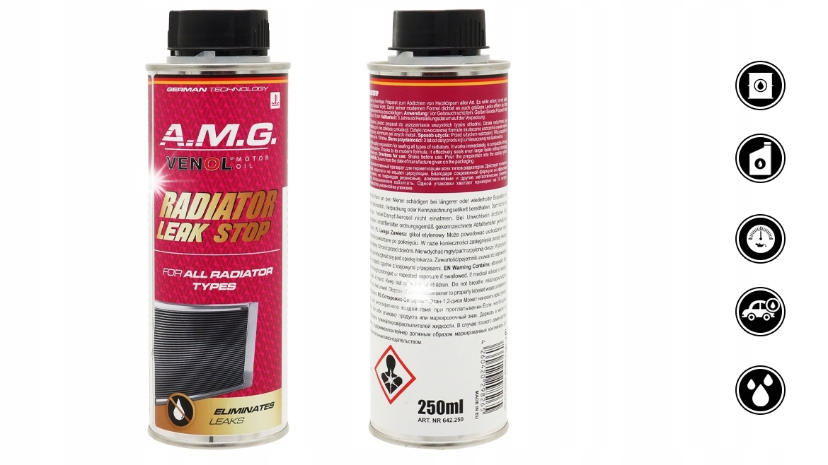 Radiator Stop Leak - це препарат найвищої якості, який завдяки спеціальній формулі ефективно та швидко герметизує радіатори, усуваючи навіть великі витоки із системи охолодження, а кевларові волокна, що містяться в препараті, гарантують високу міцність герметизації.