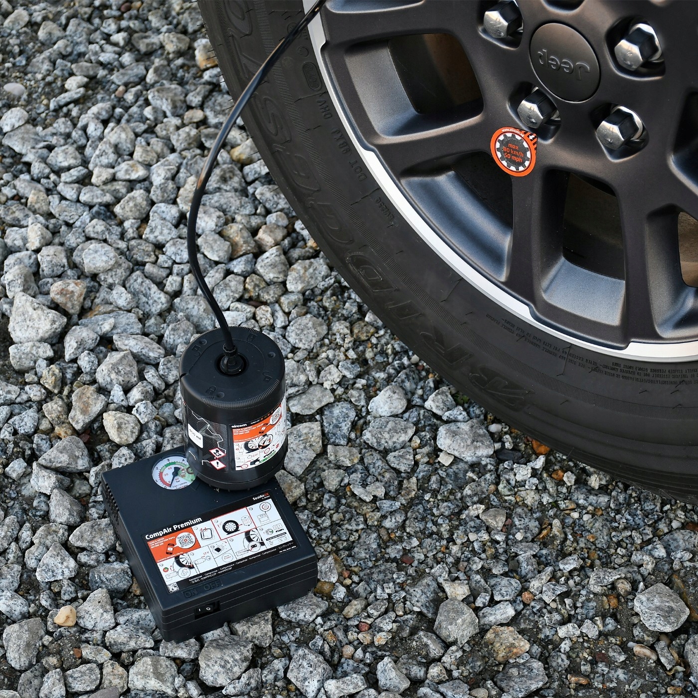 Пляшка та компресор допомагають заклеїти пробиті шини. Ефективно замінює звичайну запаску.