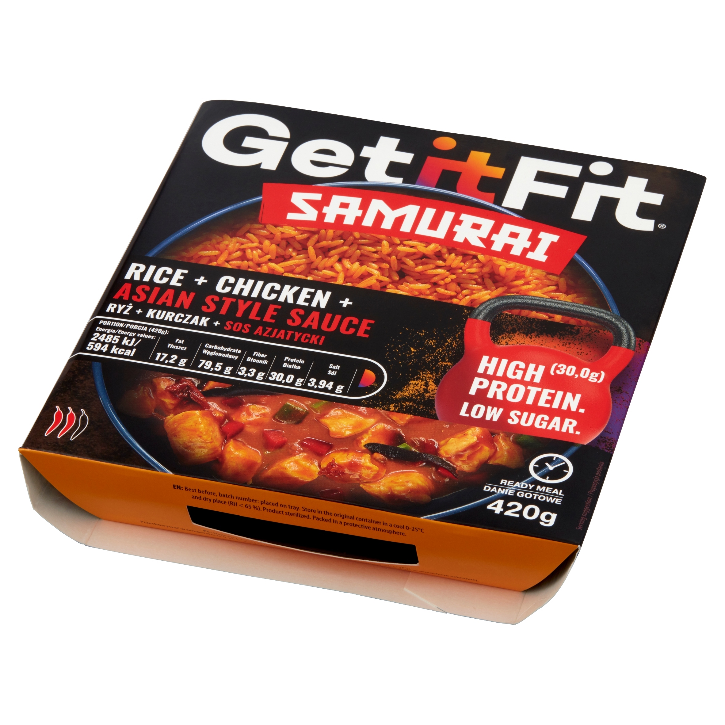 Get it Fit — правильно збалансоване спортивне харчування для активних людей і спортсменів. Страви, натхненні світовими кухнями в поєднанні з характерним сучасним дизайном упаковки, ідеально доповнюють активний спосіб життя. Великі порції, придатні для тренувань - до 420 г Харчова цінність збалансована для спортивного харчування - високий вміст білка і низький вміст цукру. Get it Fit Samurai — це поєднання азіатського соусу з куркою та рисом в оригінальній суміші спецій. Їжа з високим вмістом білка (до 30,2 г на порцію) зі східним присмаком для активних людей.