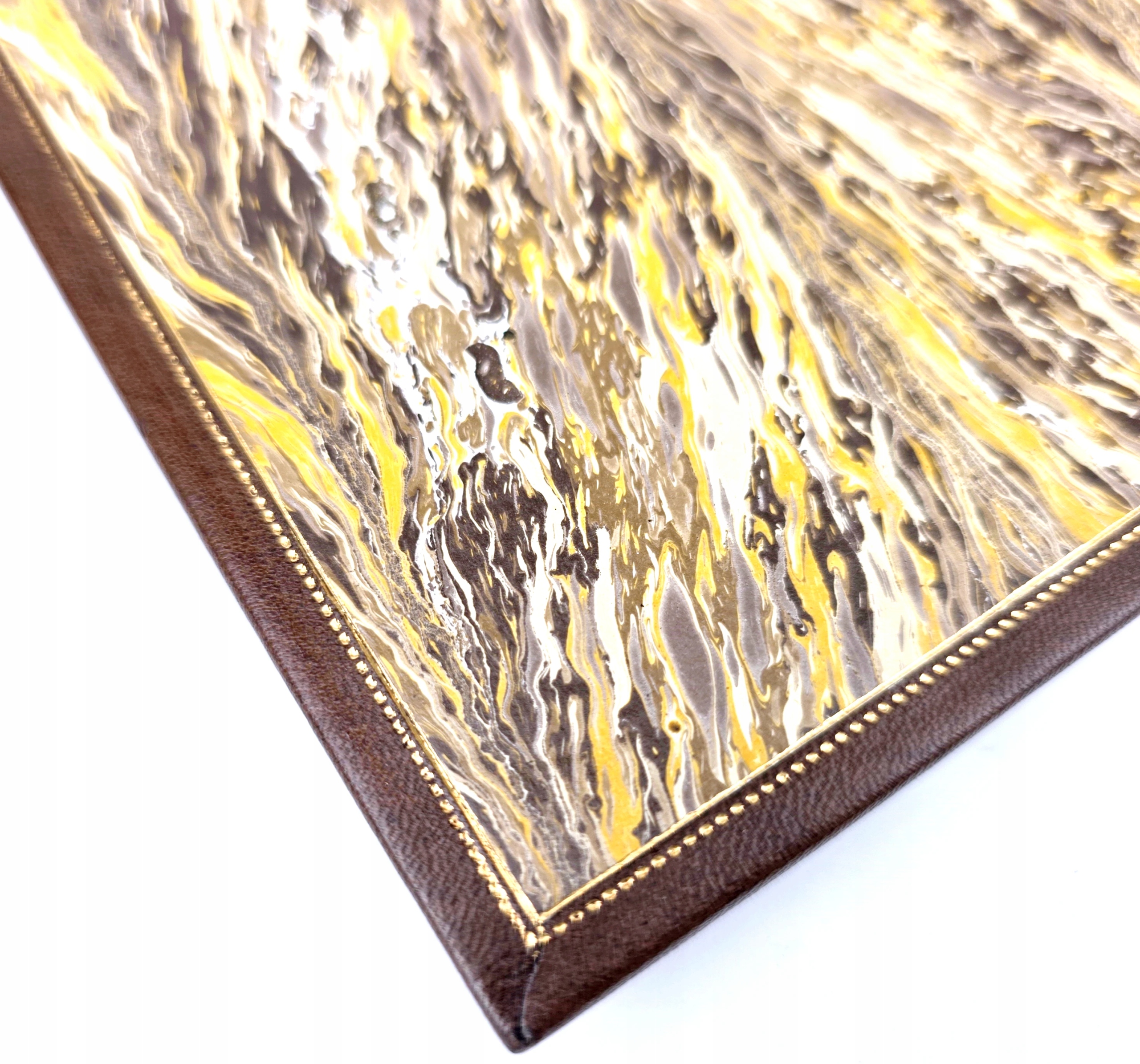 ТВЕРДА ОБКЛАДИНКА, ПОВНІСТЬ ШКІРИ, СУЧАСНІ, ОБКЛАДИНКИ, ПОКРИТІ ДЕКОРАТИВНИМ ЗОЛОТИМ ТИСНЕННЯМ. СПИНКА З ОПУКЛИМИ БУРСАМИ, ГЛИБОКИМ ТИСНЕННЯМ І ПОЗОЛОЧЕННЯМ. ПАЛИЧКИ З МАРМОРИЗОВАНОГО ПАПЕРУ ВРУЧНОГО ФАРБУВАННЯ, ВИРИЗКИ КАРТОК ПРИКРАШЕНІ ОДНАКОВИМ ВІЗЕРУНКОМ. ВНУТРІШНІСТЬ ОБКЛАДОК ВКРИТА ІНТЕНСИВНИМ ЗОЛОТИМ ТИСНЕННЯМ. ЗБЕРЕЖЕНА ВИДАВНИЧА КАРТОННА ОБКЛАДИНКА [НАКЛЕЄНА НА ПУСТУ КАРТКУ]