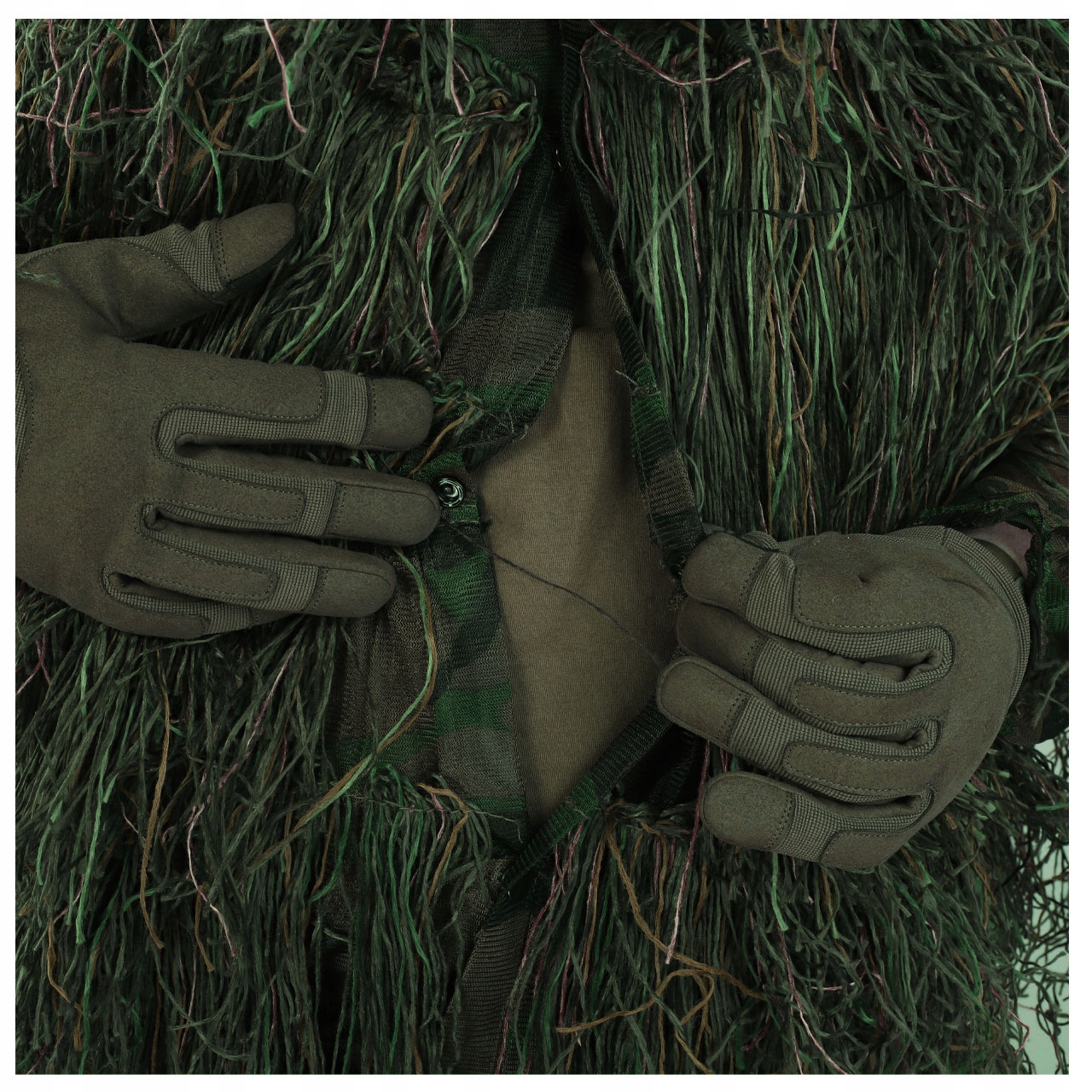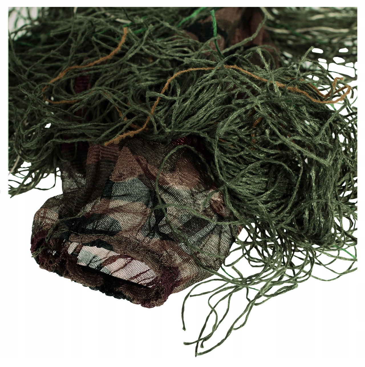 Камуфляжний комплект Ghillie Suit виробництва компанії DOMINATOR®, що складається з сітчастих штанів, толстовки, головного убору та камуфляжу для зброї, на якому хаотично розміщені шматочки пряжі різної довжини. і відтінки. Одяг створює приголомшливий ефект, неможливо знайти сховану людину на землі чи в лісовій місцевості навіть з невеликої відстані.