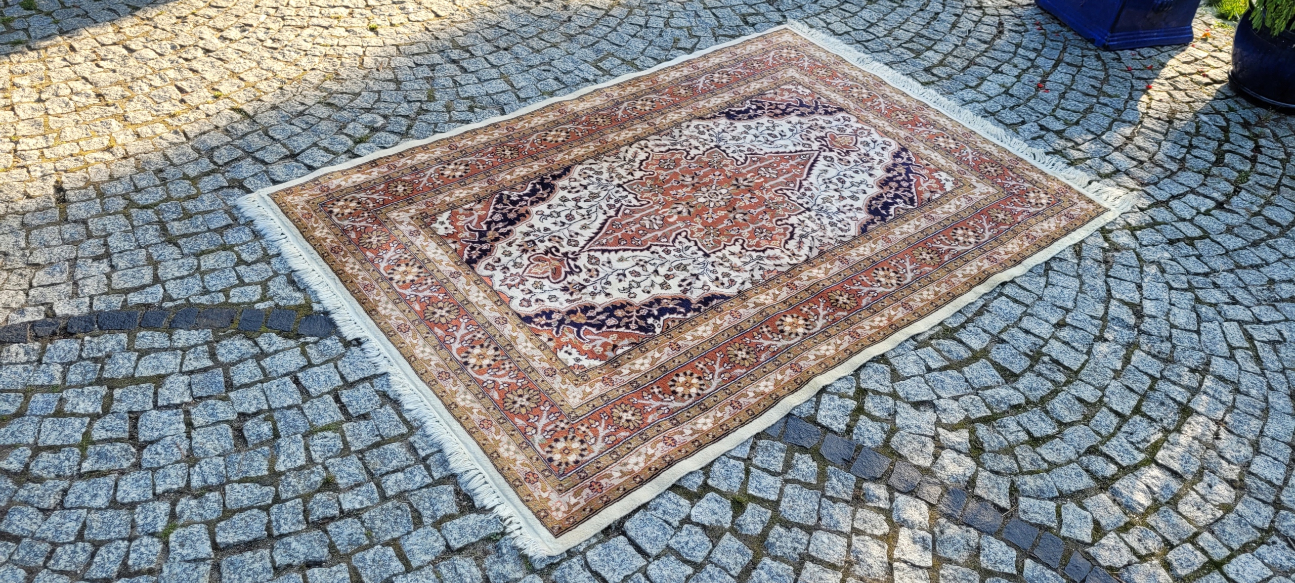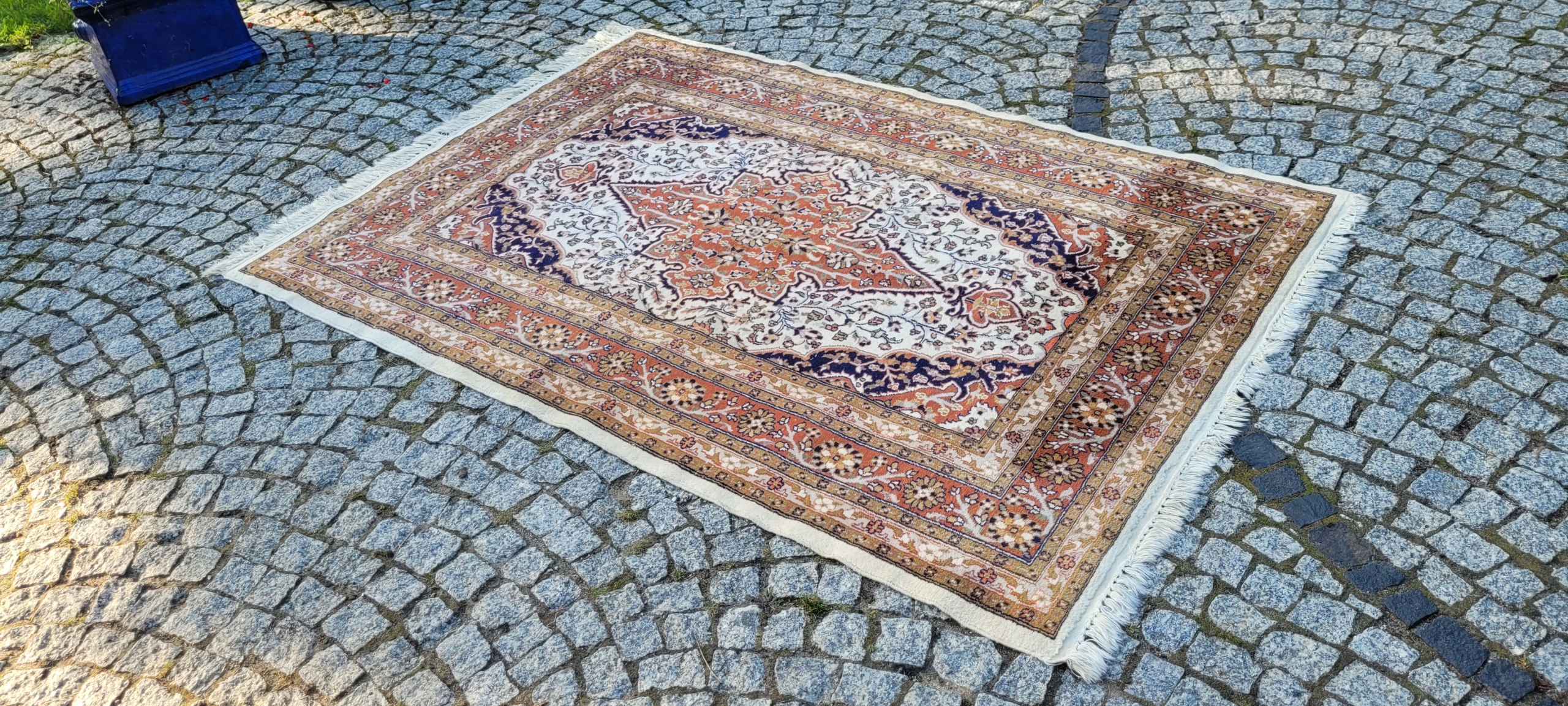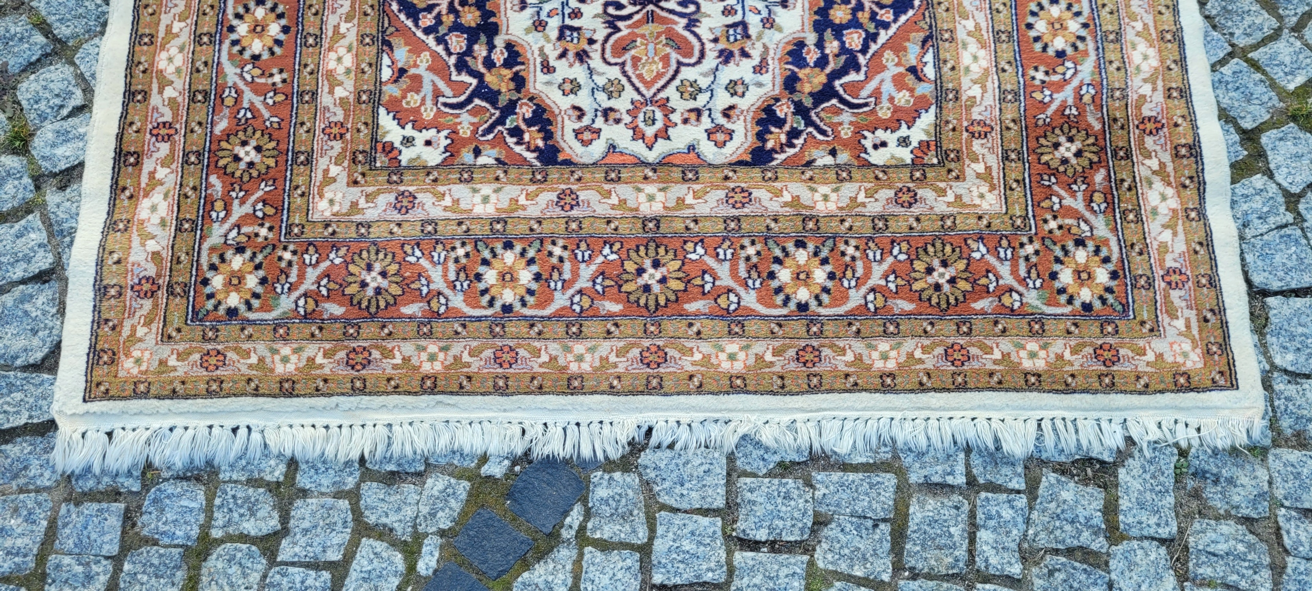 Пакистанський килим Ghom. Виткана вручну з вовни найвищої якості. Характеризується компактним, приємним на дотик, блискучим флісом і красивими кольорами та візерунками. В дуже хорошому стані з мінусом, видно на фото. Дефекти в одному куті