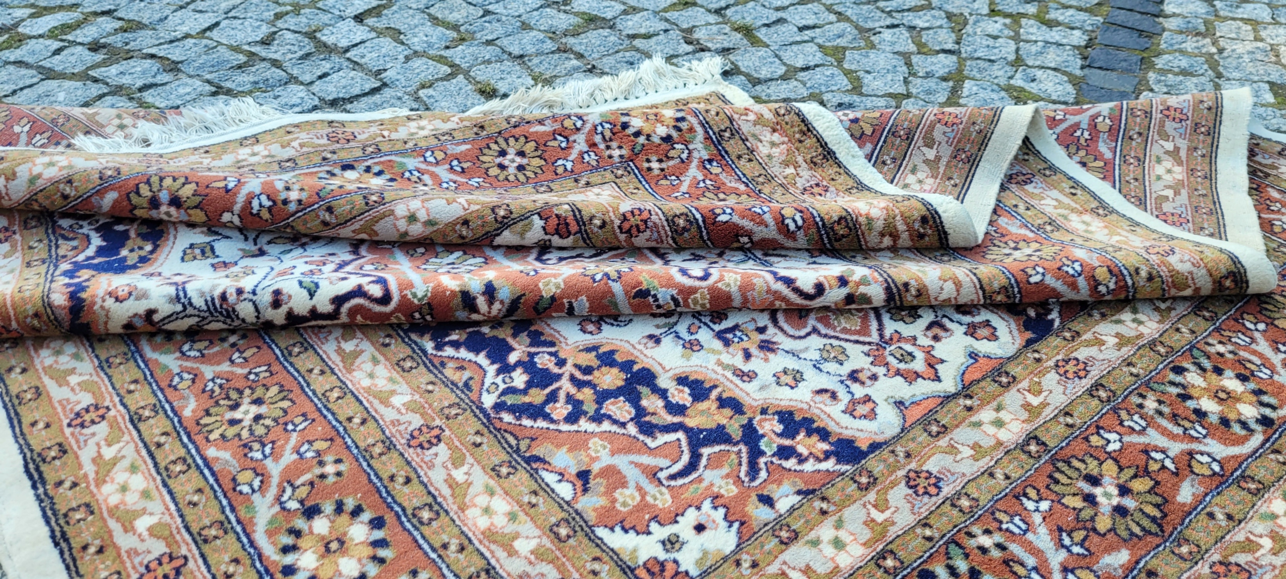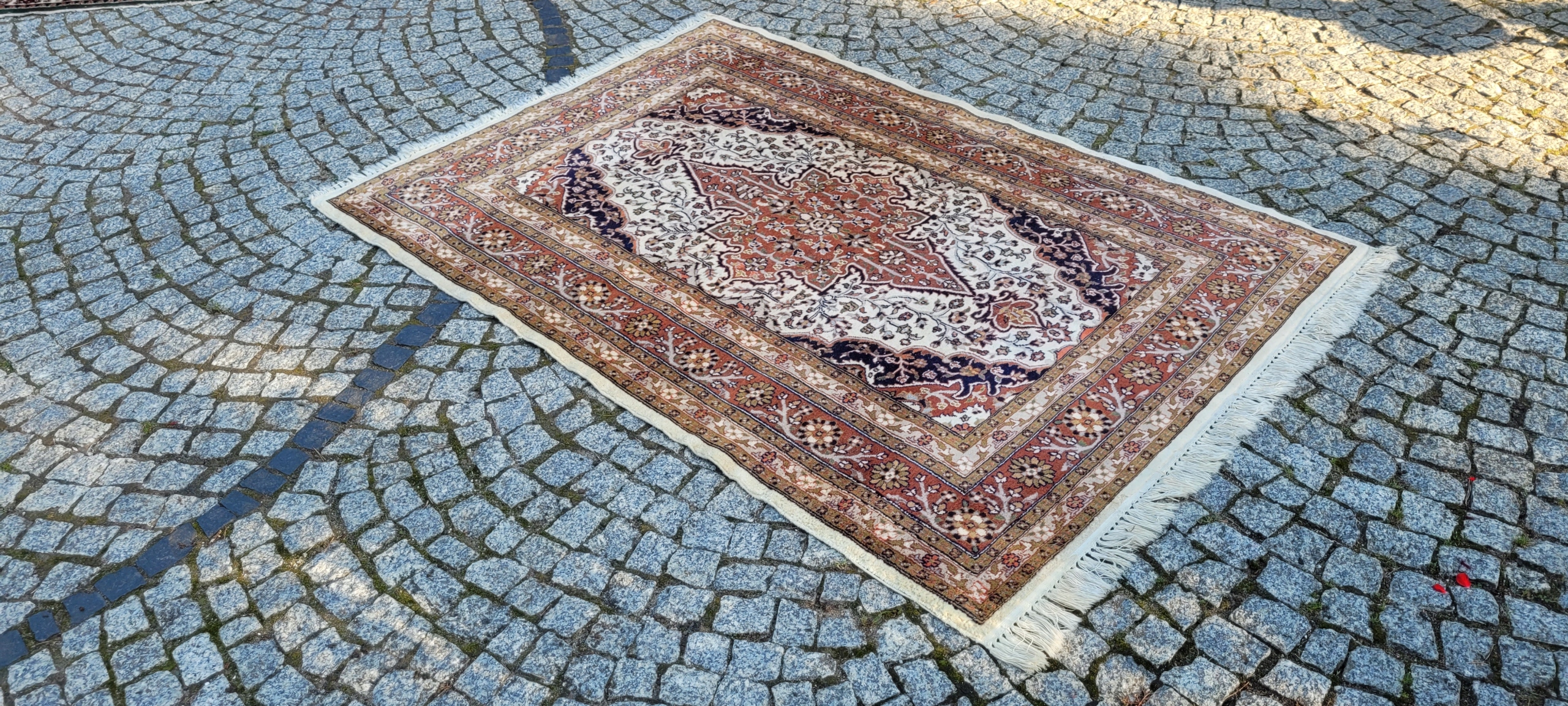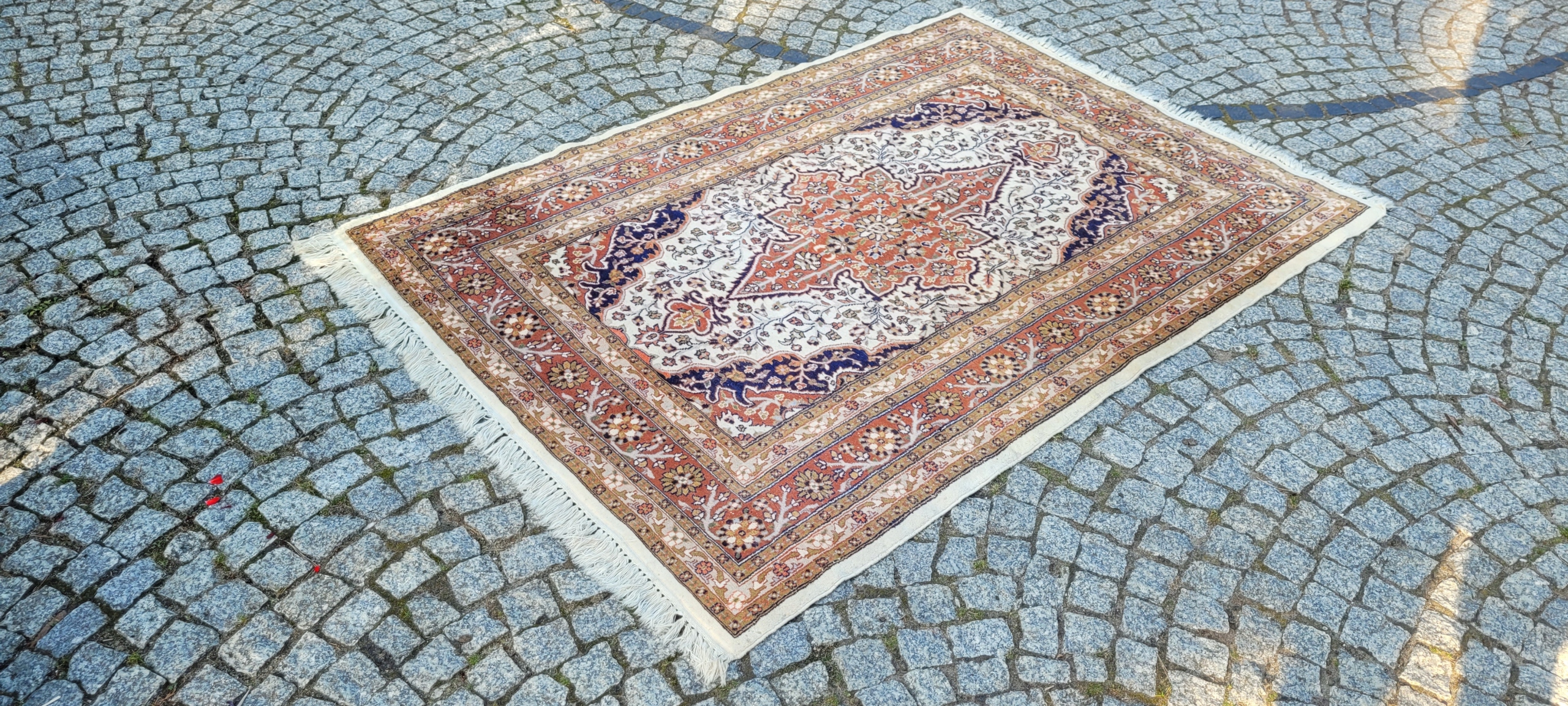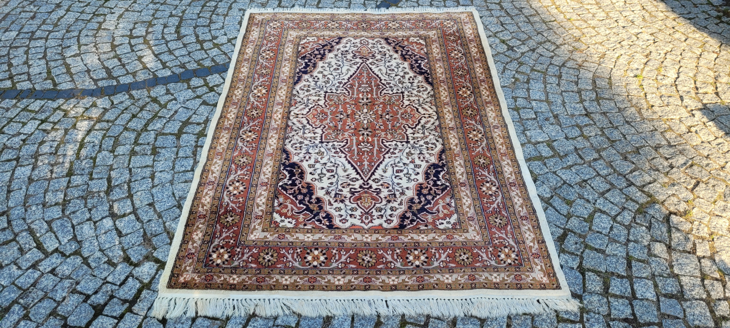 Пакистанський килим Ghom. Виткана вручну з вовни найвищої якості. Характеризується компактним, приємним на дотик, блискучим флісом і красивими кольорами та візерунками. В дуже хорошому стані з мінусом, видно на фото. Дефекти в одному куті