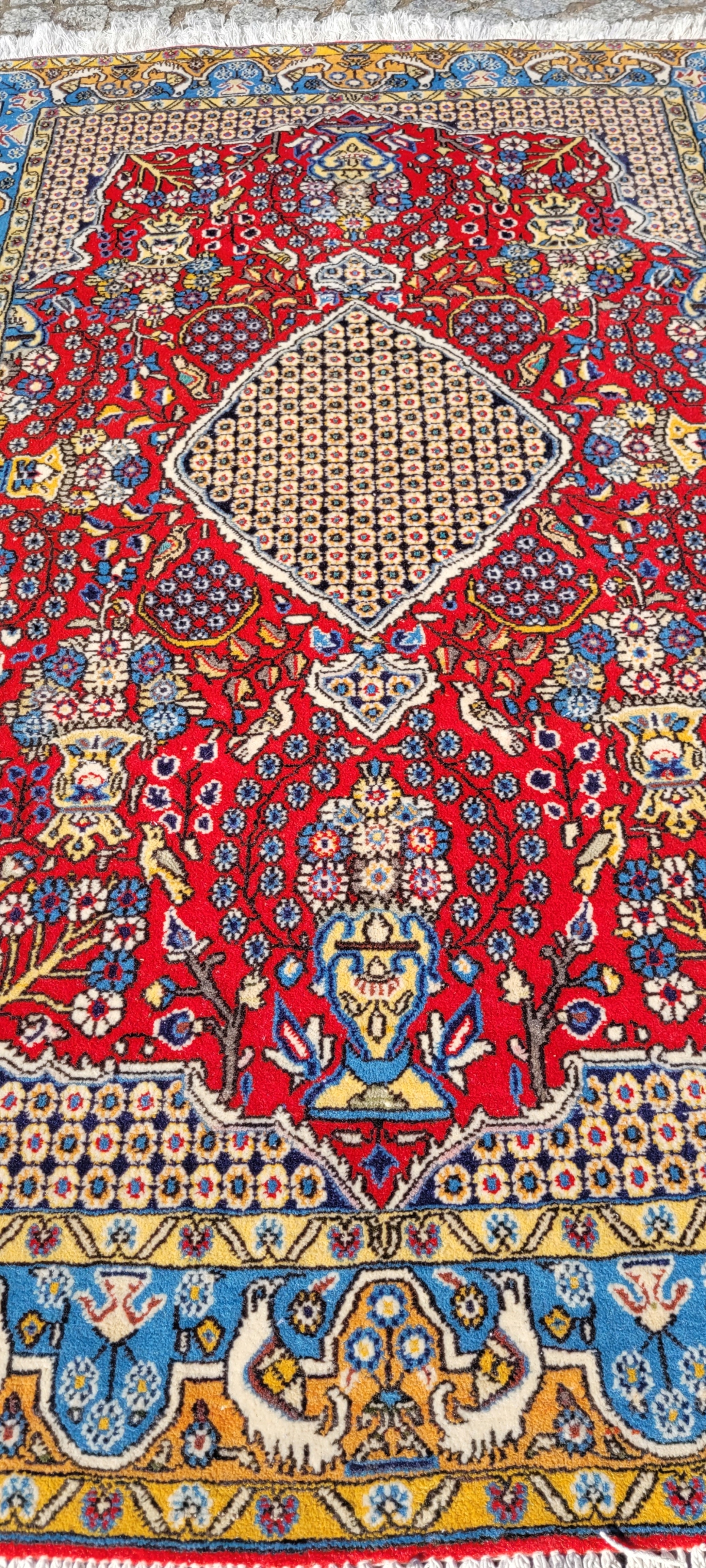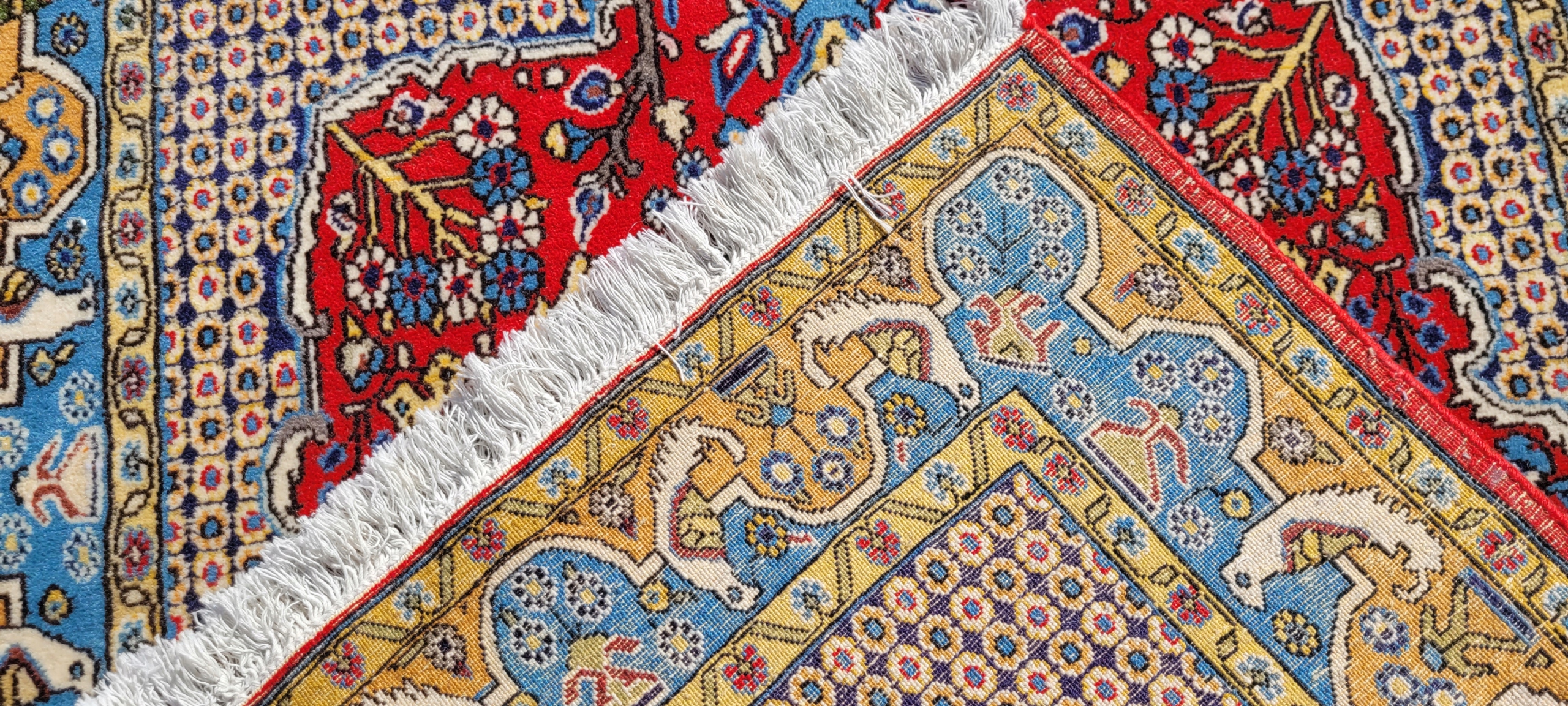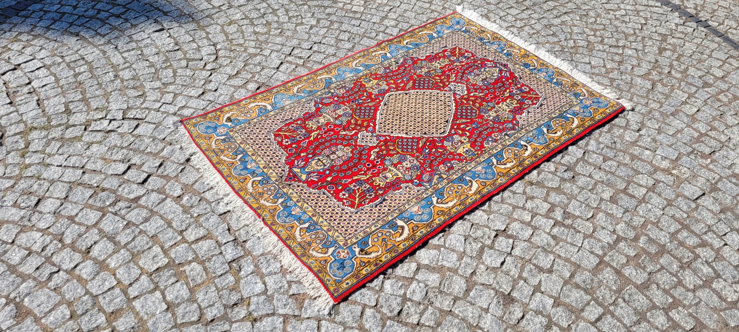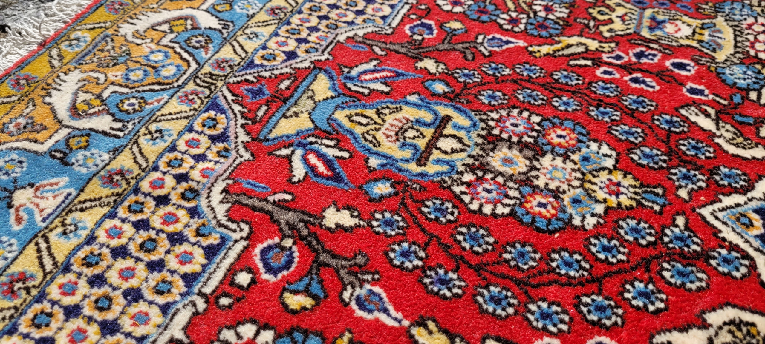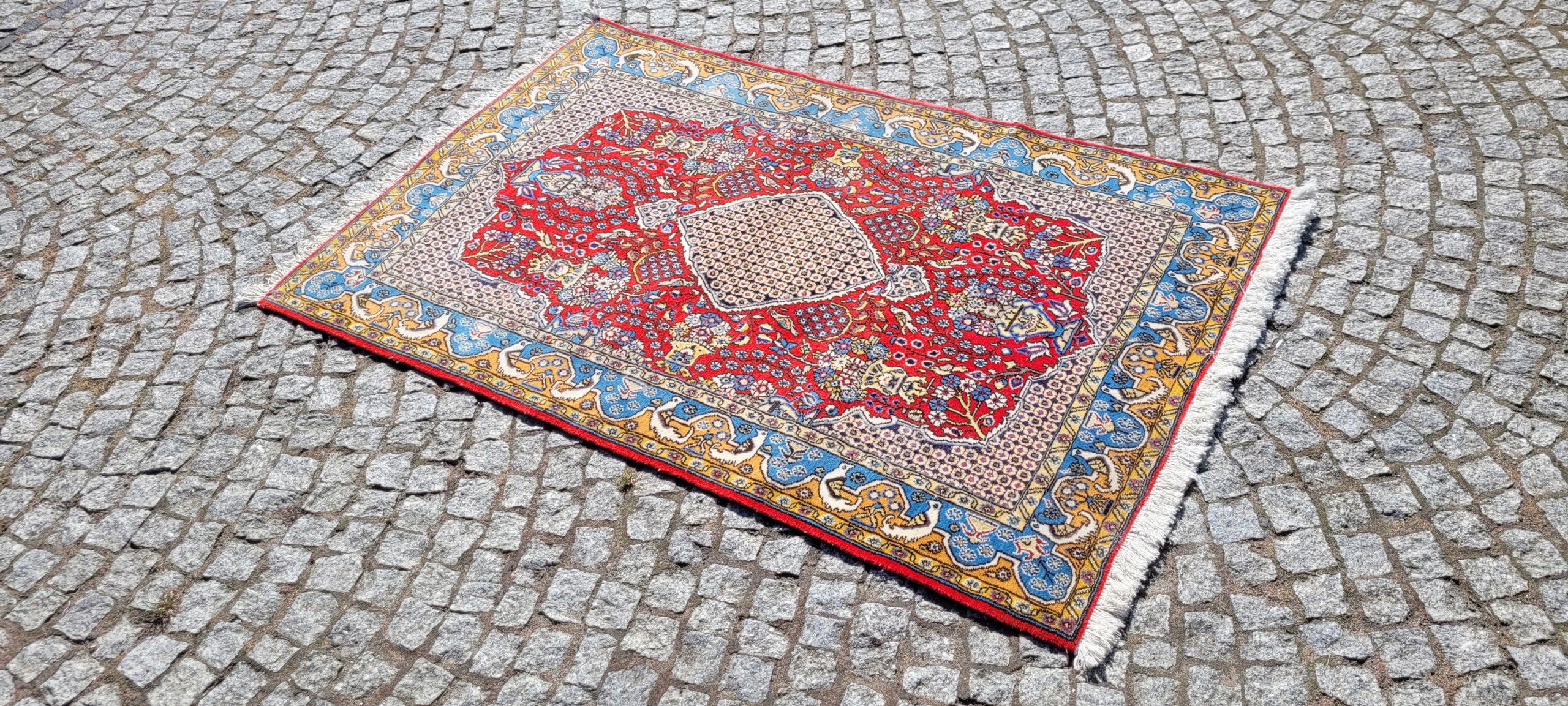 Перський килим Ghom. Виткана вручну з вовни найвищої якості. Характеризується компактним, приємним на дотик, блискучим флісом і красивими кольорами та візерунками. У дуже хорошому стані, видно на фотографіях.