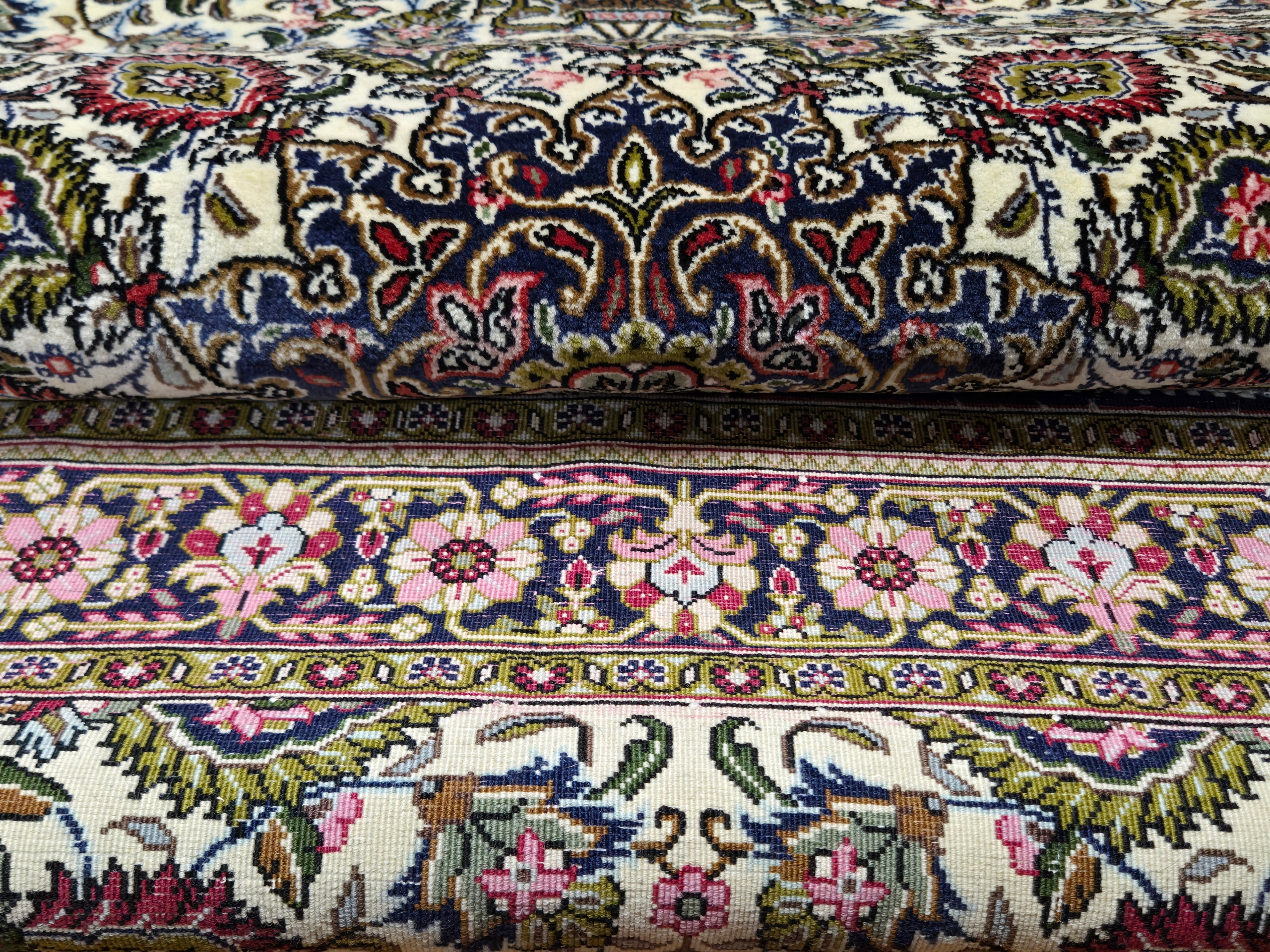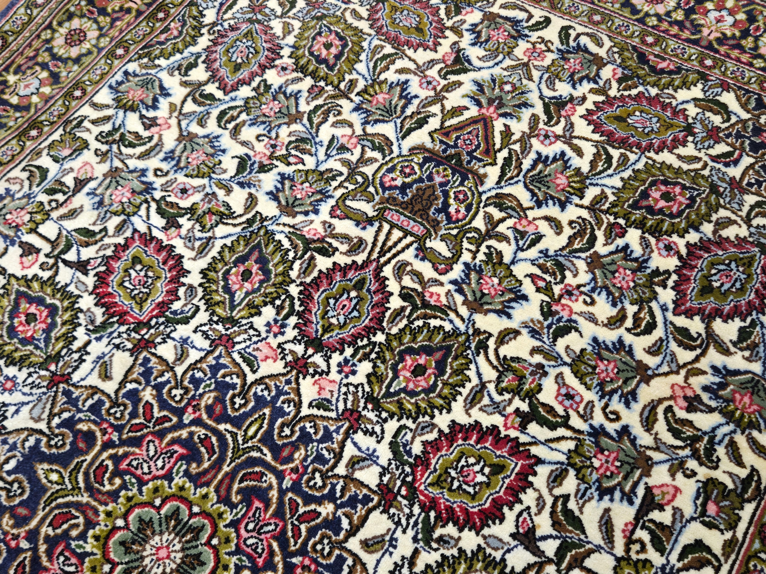 Висококласний і надзвичайно красивий оригінальний перський килим GHOUM - ручної роботи та виготовлений з овечої вовни найвищої якості. Килим, підтверджений сертифікатом якості та походження, з щільним кроєм, блискучим і оксамитовим ворсом. Східний дизайн (класичний медальйон у формі розетки, оточений чудовими квітковими композиціями) і гармонійно контрастні кольори роблять його чудовим як на підлозі, так і на стіні.
