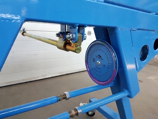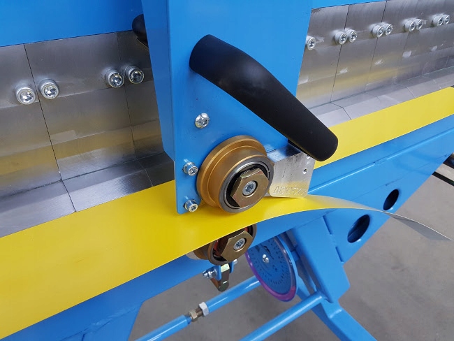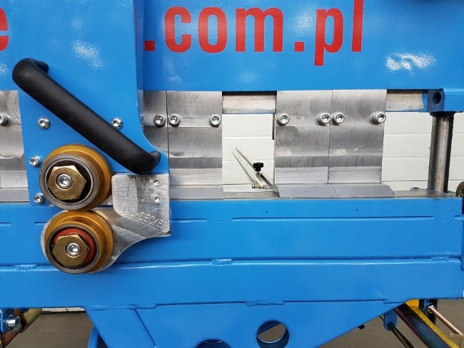 - УПОРИ ПЕРЕДНІ - дозволяє встановити ширину розрізів з передньої частини фальцювальної машини. Конструкція упорів дозволяє повертати їх на 180° і повертати в колишнє положення. Дуже корисний для послідовного різання листового металу. Передні упори використовуються в повторюваних роботах. Вони багато разів зберігають однаковий розмір довжини розрізаного металевого листа.