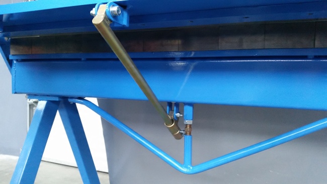 - Машина нашого виробництва відкривається за допомогою одного важіль, який піднімає всю верхню балку на 65 мм вгору. Але інші верстати, наприклад західних марок і китайські, відкриваються двома ручками, тобто окремо з лівого боку і окремо з правого боку, що значно ускладнює роботу листорізу!!!