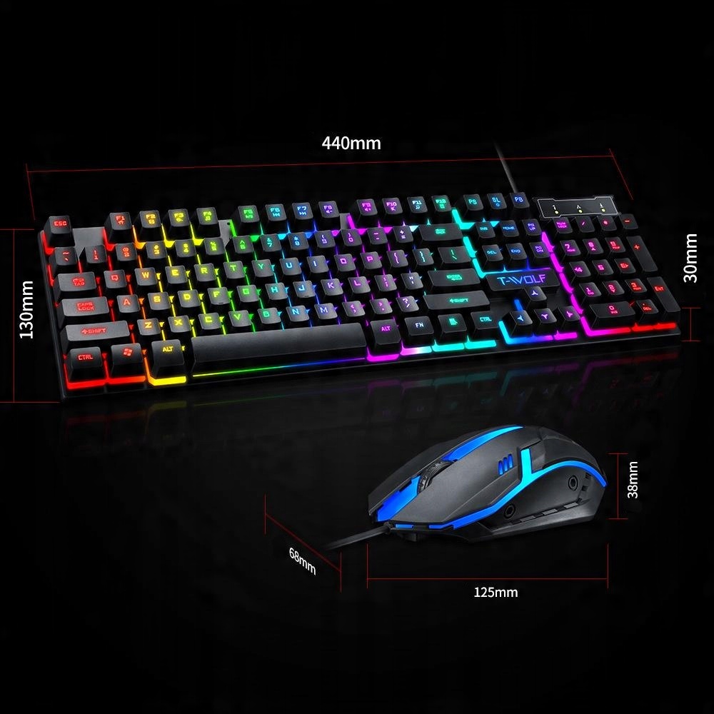 Клавіатура постачається з ігровою мишкою T-Wolf. Завдяки своїй ергономічній формі він ідеально лежить у руці. Мишка оснащена RGB підсвічуванням, яка плавно змінюється під час гри. Миша також має лазерний датчик, що забезпечує високу чутливість і точність. Це ідеальне доповнення до набору гравця.