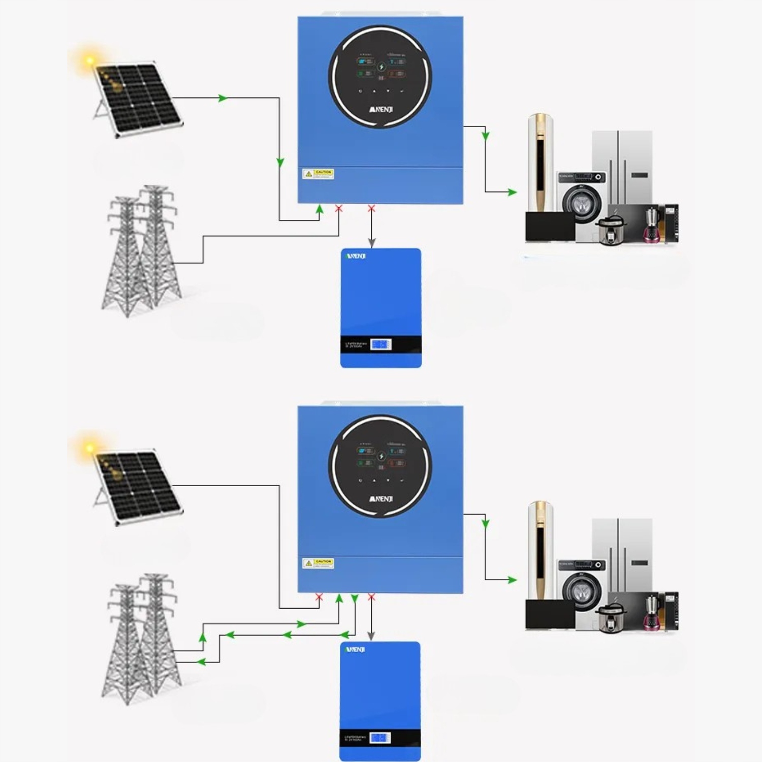 - Поза мережею (острів): PV → забезпечує навантаження, надлишок заряджає акумулятор; при відсутності сонячного світла живлення від акумулятора; коли статус низький - він автоматично вибирає мережу змінного струму.