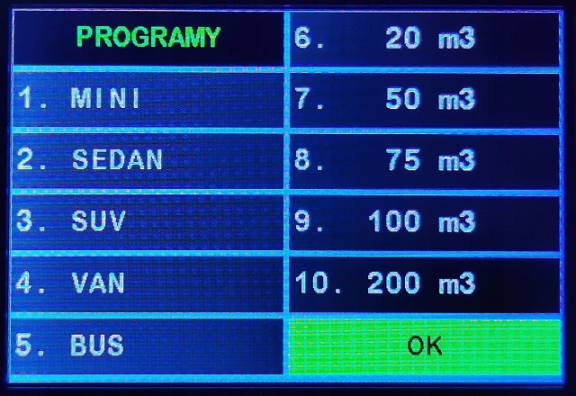 Введіть висоту, ширину і довжину кімнати в метрах [м]. Після натискання кнопки [ OK ] контролер буде встановлений на оптимальні значення циклу озонації. Параметри набору будуть відображатися. Індивідуальні параметри можна вільно змінити.