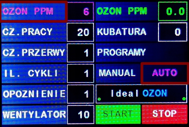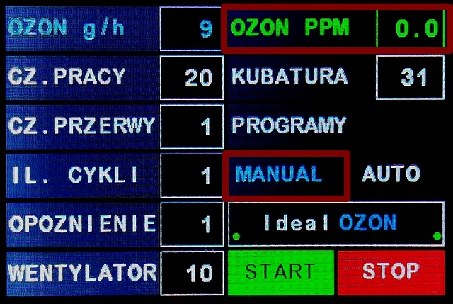 - Колір червоний означає досягнення заданого рівня Ozone/O3 в проміле, наприклад 1 проміле та вимкнення кварцової трубки