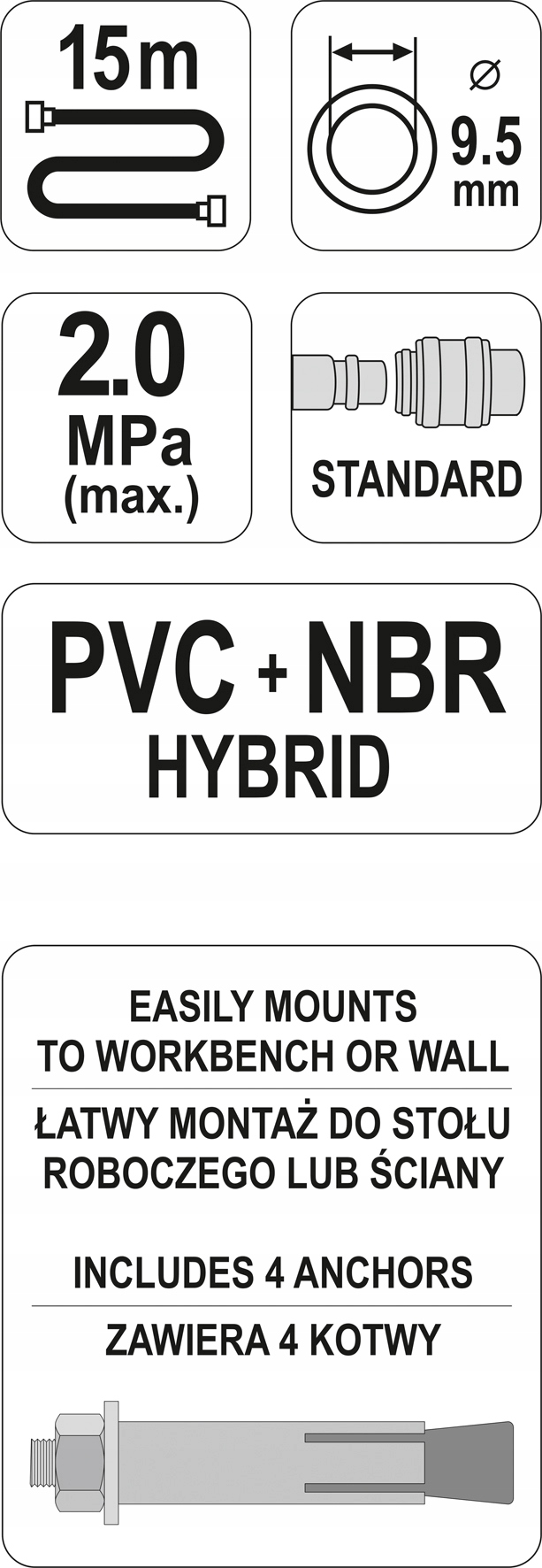 Професійний гібридний пневматичний кабель на валиці з кривошипами Yato YT-24241, виготовленими з ПВХ та NBR, Zakuzy у стандартних швидких муфтах призначений для застосувань де б не використовуватися стиснене повітря .
