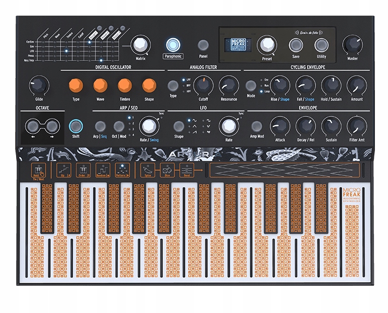 Арпеджіатор і покроковий секвенсор: записуйте до чотирьох автоматизованих записів, редагуйте ноти за крок або використовуйте інноваційні параметри рандомізації. Покроковий секвенсор і арпеджіатор MicroFreak потужні та цікаві у використанні.