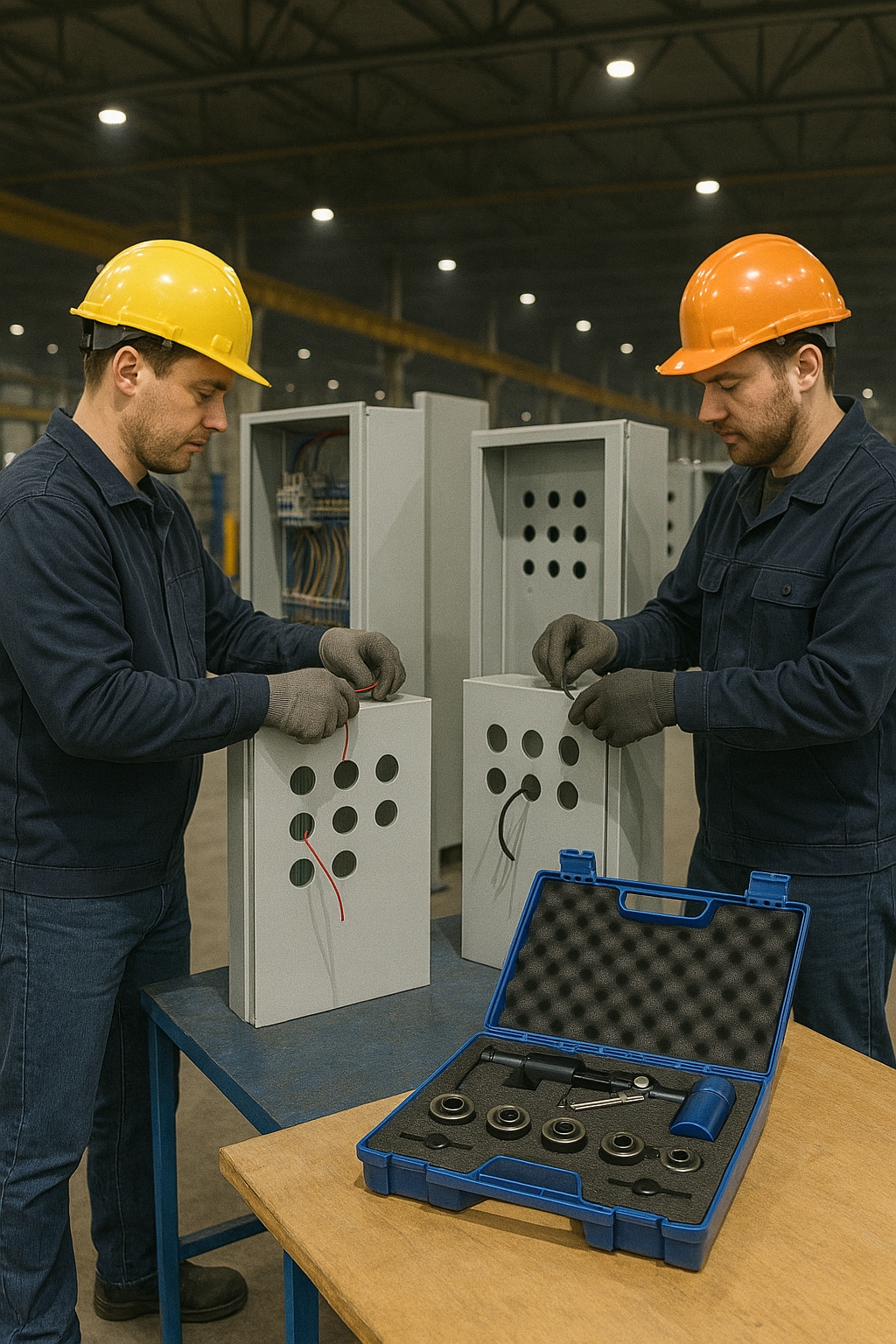 Набір для вирізання круглих отворів у листовому металі. Головка ручного гідроциліндра може повертатися на 360 градусів. Призначений для вирізання отворів у виробництві розподільних шаф під монтажні коробки або вимикачі. При вирізанні отворів поверхня листового металу не деформується і не пошкоджується. Набір легко транспортувати - упакований у міцну валізу німецького виробництва / MADE IN GERMANY / Містить плашки та пробійники для вирізання отворів.