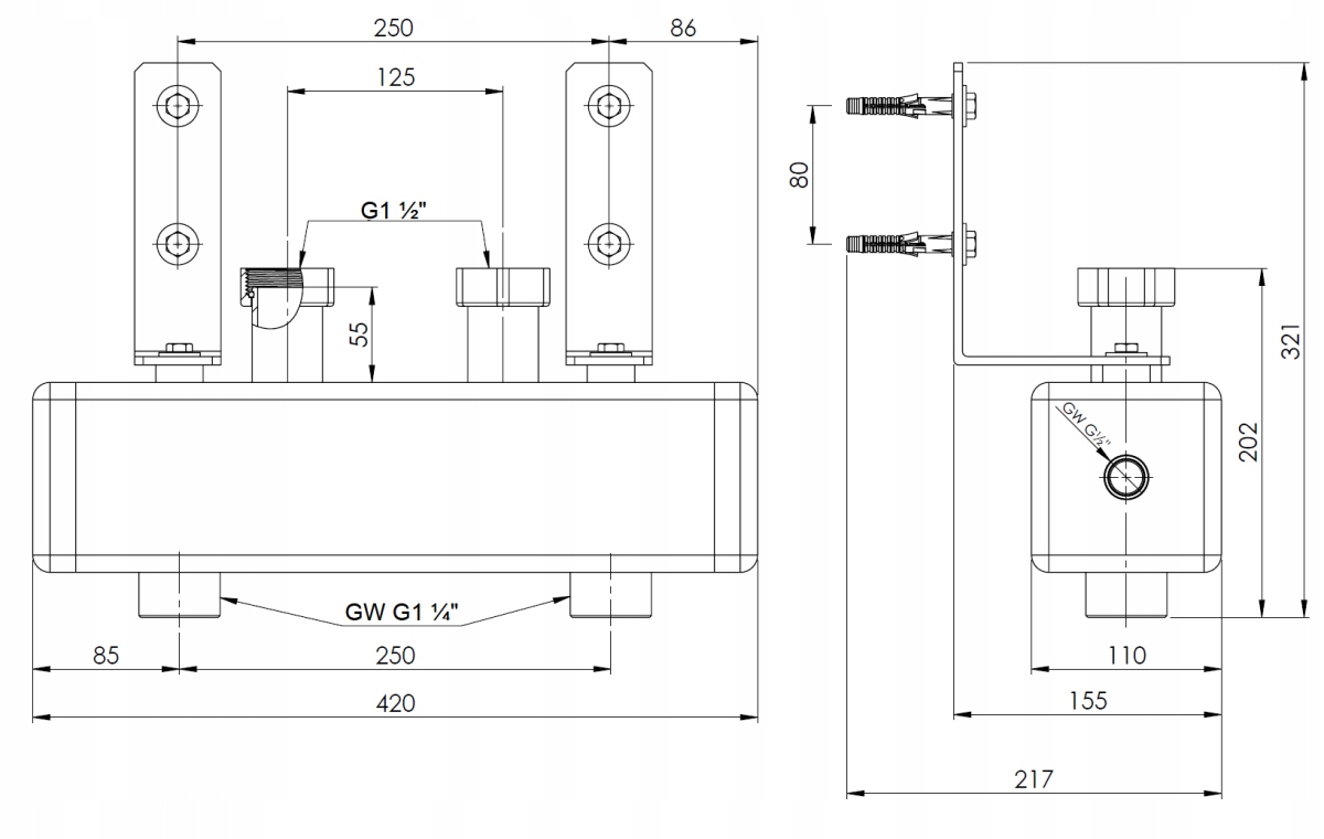 - З'єднання G1/2'' GW з боку муфти, призначене для монтажу зливного клапана або занурювальний рукав датчика температури. ul>