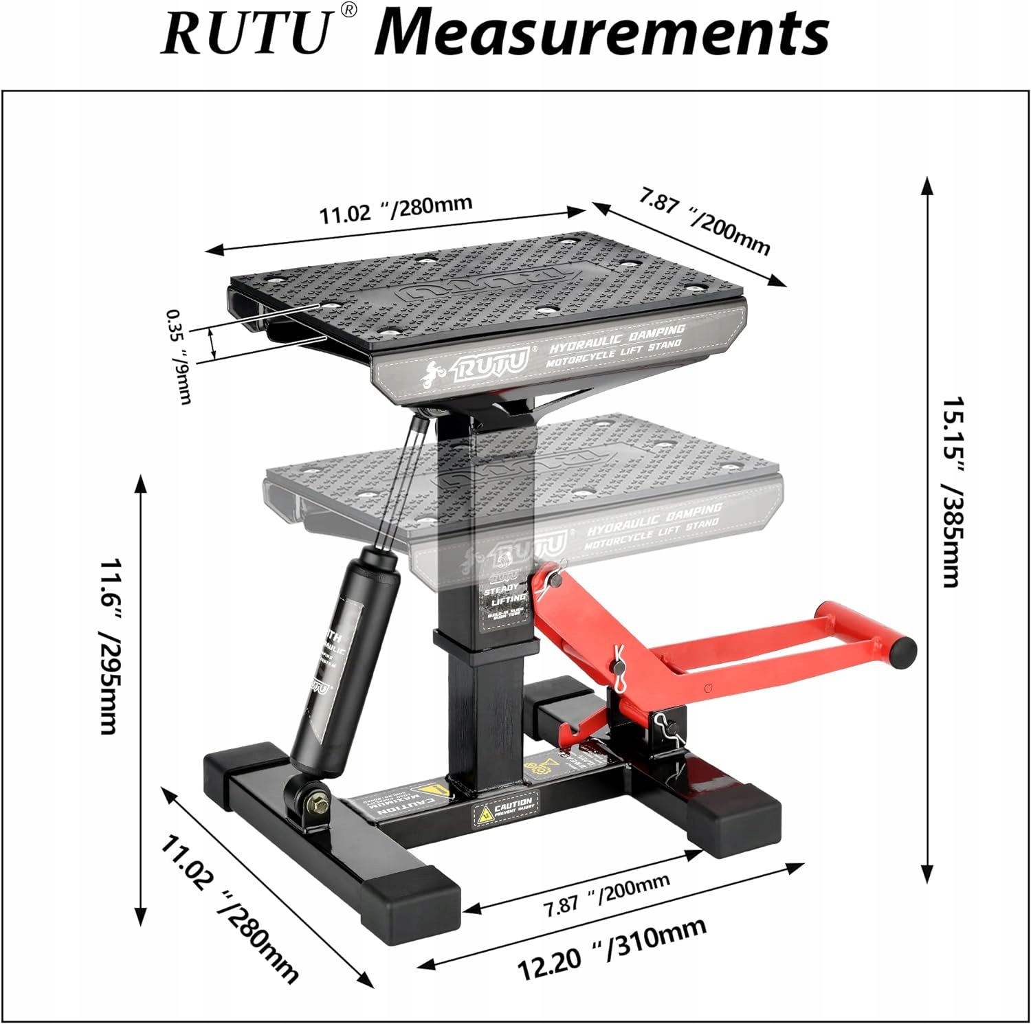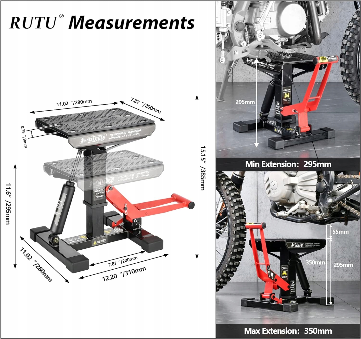 ціна знижена через пошкодження упаковки. Товар новий, не використовувався. Універсальне обладнання для майстерень. Цей підйомник для мотоциклів має 2 рівні висоти: мінімальна висота платформи 11,6 дюймів (295 мм)/максимальна (піднята) висота платформи 15,15 дюймів (385 мм). Ідеально підходить для мотоциклів з нижньою рамою/кліренсом двигуна від 11,81" до 13,78" (300 мм - 350 мм). Перед покупкою виміряйте мінімальний дорожній просвіт вашого мотоцикла, щоб мінімальна висота підставки не була занадто високою та нею не можна було користуватися. Міцна конструкція, корисна конструкція - Ця підйомна підставка для мотоцикла має посилену зварену сталеву раму для додаткової міцності та стабільності. Гідравлічний насос працює плавно, а вбудований амортизатор робить опускання велосипеда безпечнішим і легшим. Нейлонова стабілізуюча втулка зменшує зазор між сталевою рамою, запобігаючи розгойдування мотоцикла під час підняття. Протиковзаюча нітрилова поверхня та висока місткість - підставка для мотоцикла має міцну гумову накладку та стійку до подряпин робочу поверхню, яка захищає велосипеди від ковзання та подряпин, що викликають іржу. Нековзна платформа має розміри 11 1/32 x 7 7/8 дюймів. (280х200 мм), 8 заклепок з круглою головкою міцно фіксують гумову прокладку. Його максимальна вантажопідйомність становить 450 кг. Це також робить його придатним для квадроциклів, позашляховиків і снігоходів. Простий у використанні - оснащений ножним важелем для підйому для легкої роботи. Просто натисніть на металевий важіль, щоб підняти мотоцикл. Він має ергономічний дизайн, вимагає менше зусиль і простий у використанні. Для ремонту, технічного обслуговування та зберігання - цей велосипедний підйомник ідеально підходить для заміни шин, масла та фільтрів, а також для чищення вашого автомобіля. Це також буде чудовим місцем для паркування взимку.