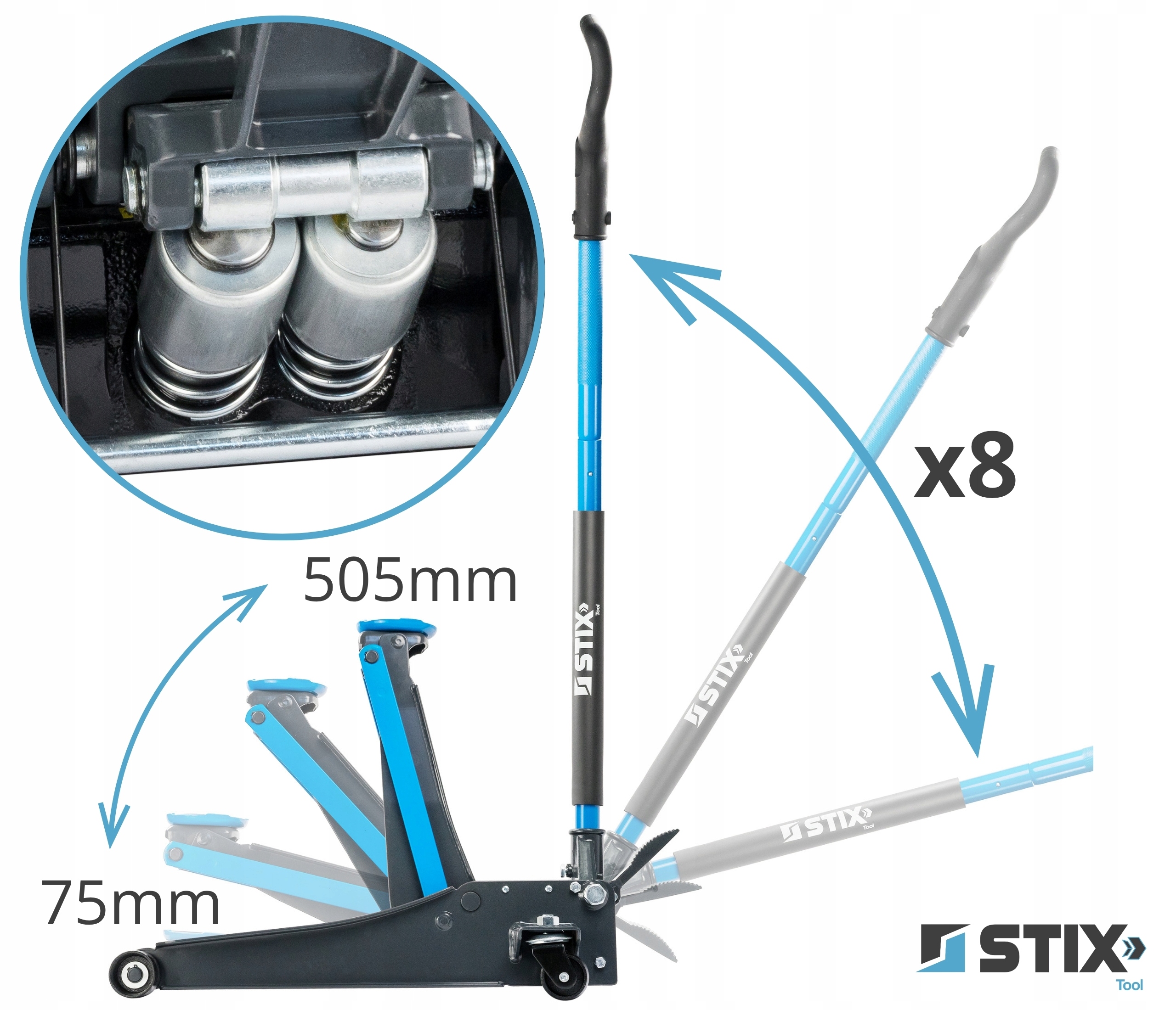 Завдяки системі двох циліндрів, повне підняття транспортного засобу можливе після 8 повних рухів з важелем або пресом педалі.