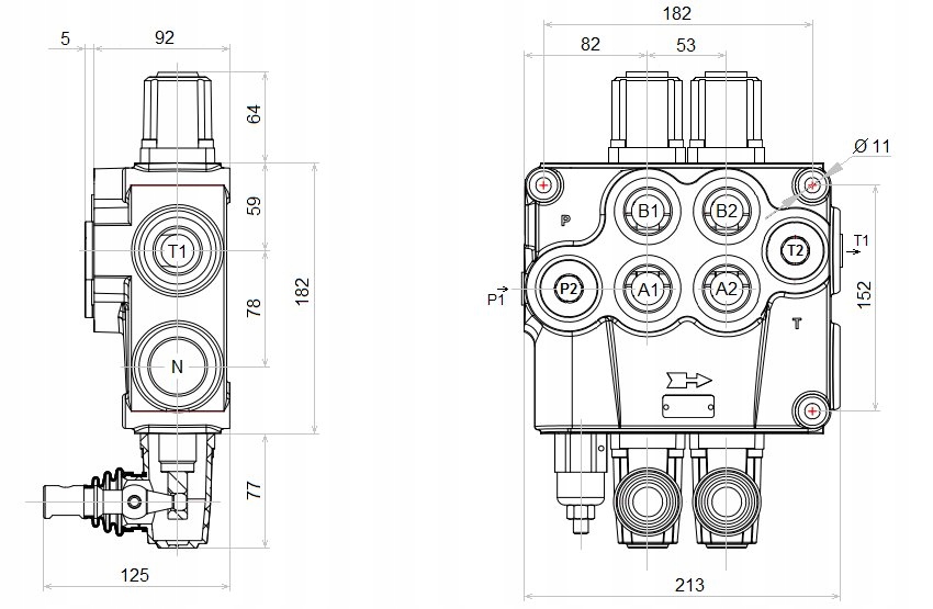 - Power supply from the pump (P1, P2): internal thread BSP 1 ''