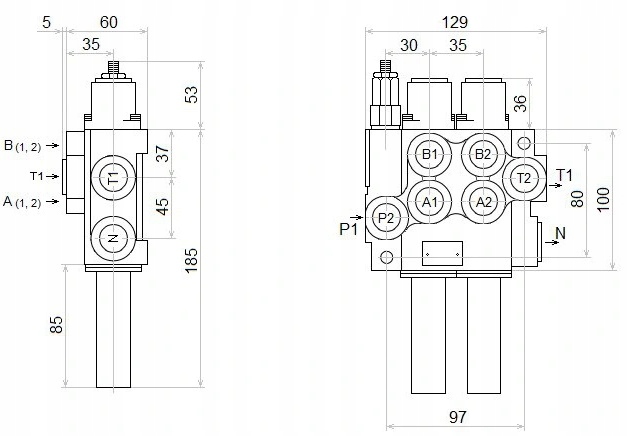 - Подача від насоса (P1, P2): BSP 1/2'' внутрішня різьба