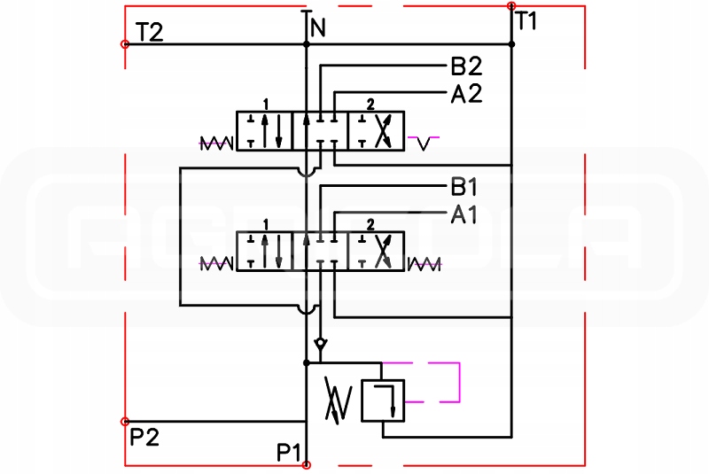 - Гідравлічна діаграма обох повзунок: A (після випуску важеля в нейтральне положення, повзунок вирізає вихід A і B, що призводить до негайної зупинки та блокування приймача, наприклад, пані або гідравлічного двигуна)