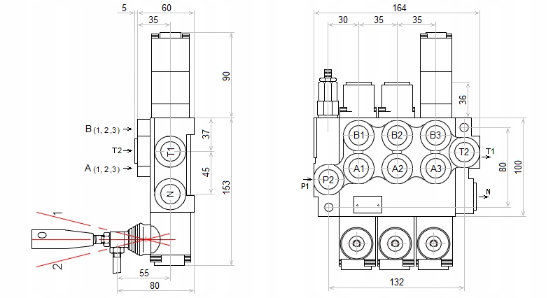 - Блок живлення від насоса (P1, P2): BSP 1/2 '' Внутрішня нитка 3/8 ''
