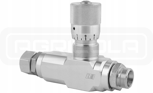 Дросельно-зворотний клапан регулює (дроселює) потік в одному напрямку, а в іншому – вільний. Регулювання потоку залежить від тиску масла та його типу, здійснюється за допомогою ручки, налаштування можна закріпити стопорним гвинтом.