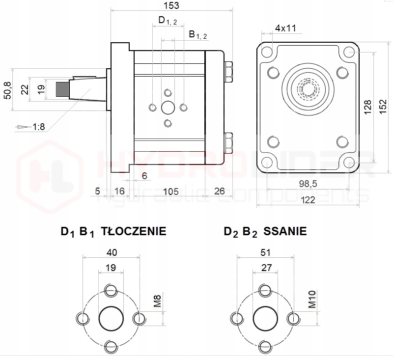 - Всмоктувальний порт D1: 40 мм ( 4xM8), B1: 19 мм