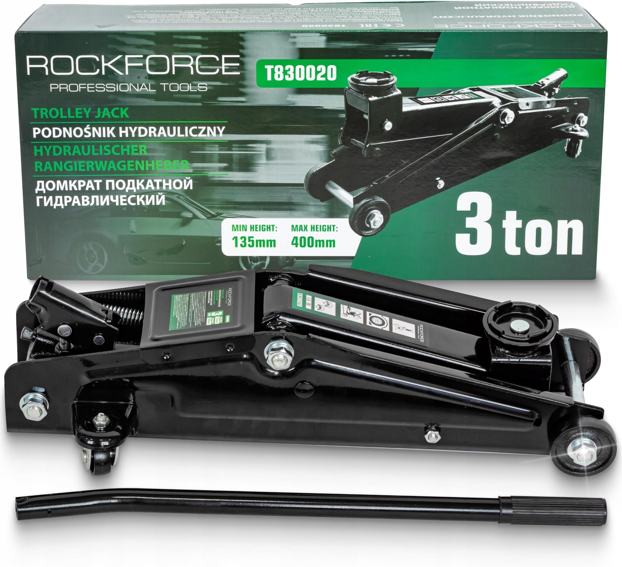 Гідравлічний підйомник ROCKFORCE T830013 — це надійний інструмент із вантажопідйомністю 3 тонни, який може підняти майже будь-який легковий автомобіль, фургон або причіп. Діапазон підйому 135-380 мм дозволяє безпечно розмістити опору під порогами рами, забезпечуючи при цьому достатньо місця для заміни коліс, роботи гальм або заміни масла. Завдяки компактним розмірам 63,5 х 29,5 х 16,5 см і вазі 17,2 кг підйомник поміститься в багажнику, гаражі або майстерні, не займаючи зайвого місця.