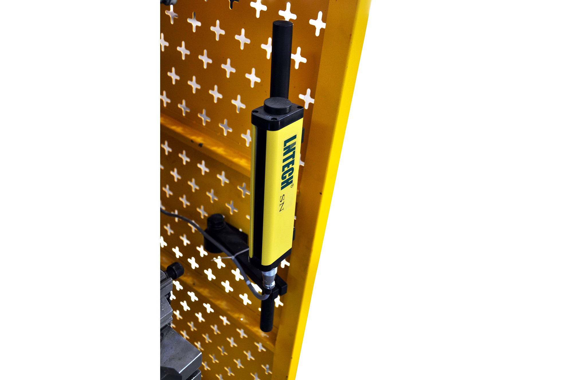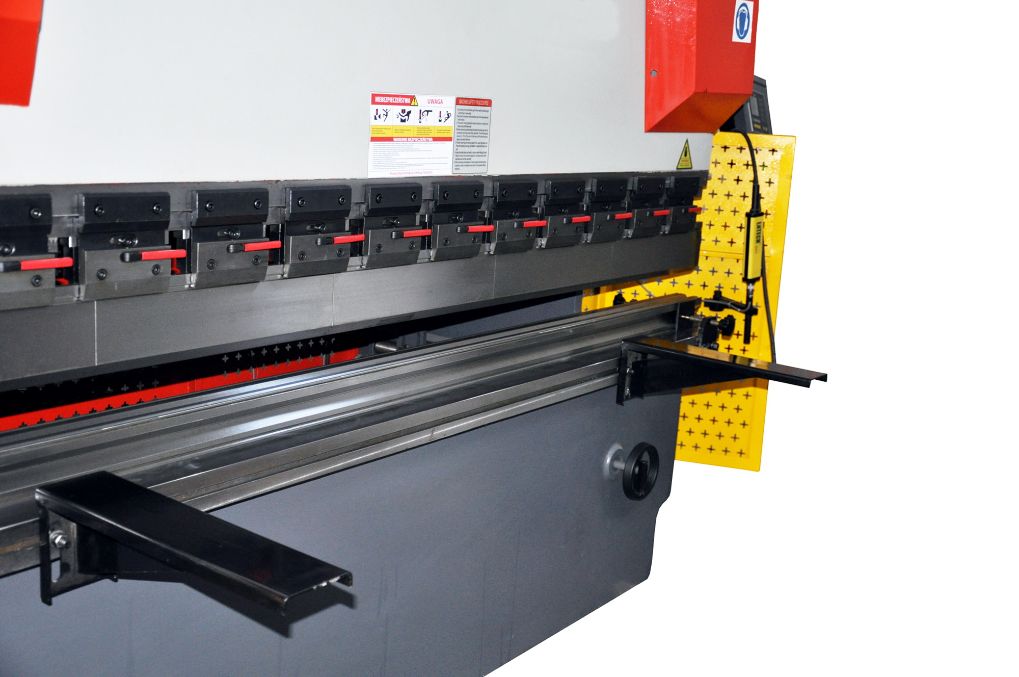 Наші преси розроблено з урахуванням безпеки наших клієнтів та їхніх працівників. Вони оснащені видимими маркуваннями, бічними кришками, задніми запобіжними воротами, легкодоступними запобіжними вимикачами та світловими воротами, які запобігають випадковому доступу рук між пуансоном і матрицею під час роботи машини.
