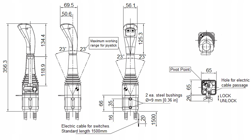 Налаштований для механічного керування двома секціями розподільника. Крім того, він має дві кнопки та вихід електричного джгута, який також дозволяє керувати, наприклад, двома електромагнітними клапанами. Конструктивні елементи всередині джойстика виготовлені з алюмінію, корпус з міцного пластику. Європейське виробництво NIMCO