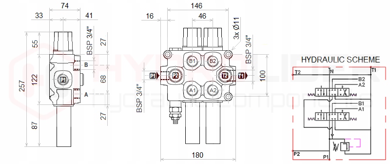 ГІДРАВЛІЧНИЙ РОЗПОДІЛЬНИК 2Q75 90L + 3 та 4 СЕКЦІЇ + JOY 2P + LINKS 2M