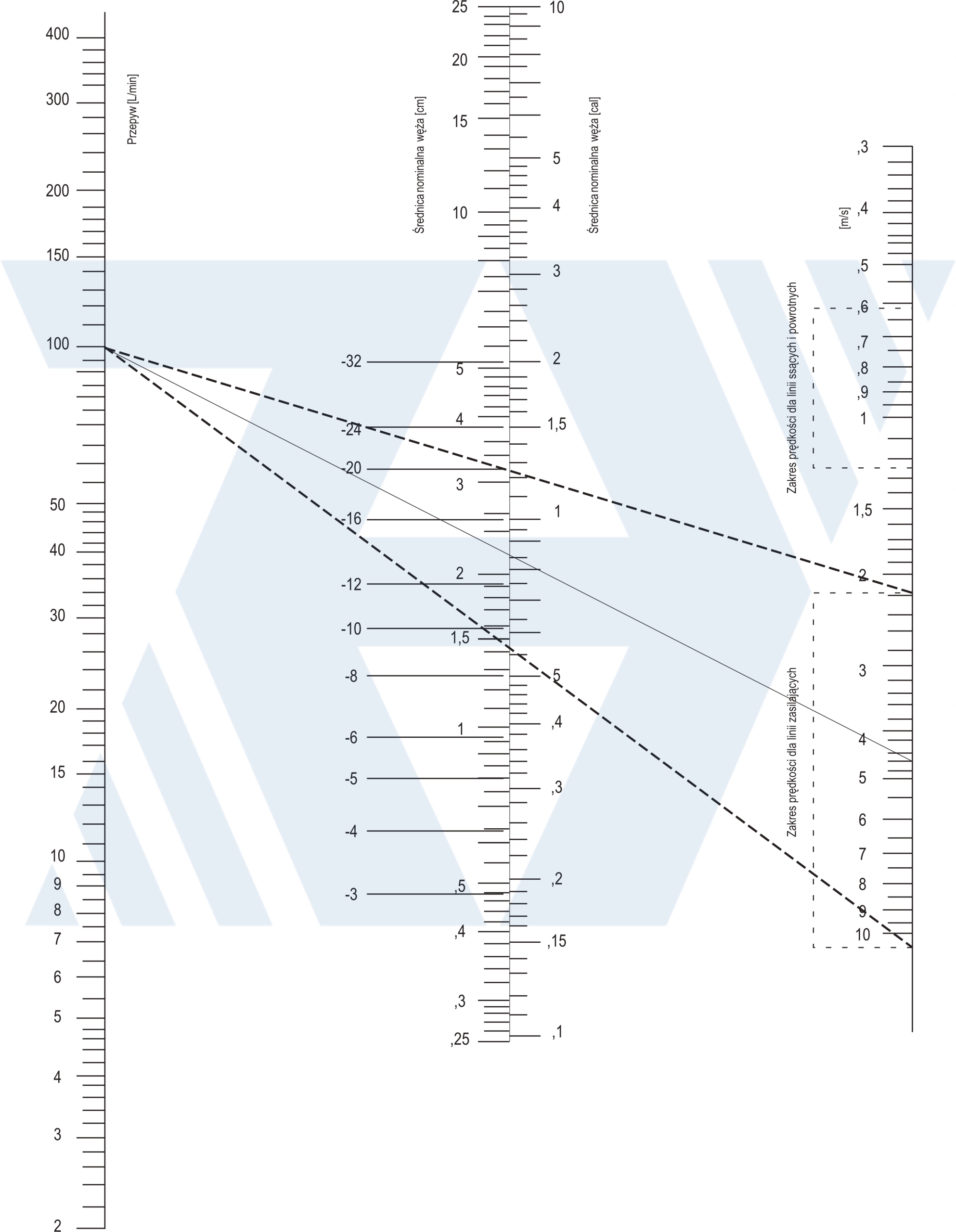 Щоб визначити відповідний діаметр гідравлічного шланга, вам потрібна лінійка, один кінець якої застосовується до значення потоку (ліва лінійка), інше – до значення швидкості потоку (закон лінії) залежно від місця використання труби.