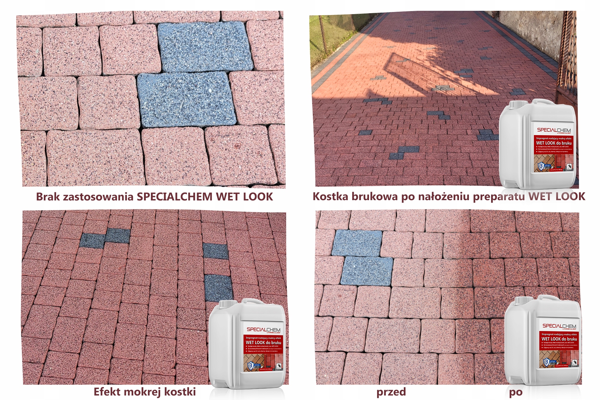 Засіб для просочення бруківки, надання ефекту «мокрої поверхні» - поглиблення кольору. Використана формула забезпечує тривалий захист від бруду, води та плям. Крім того, завдяки наночастинкам ми отримуємо поверхню STAYCLEAN, тобто її легко мити. Взимку це полегшує видалення льоду та прибирання снігу. Гідрофобізує, захищає від води та плям, стійкий до ультрафіолету та поганих погодних умов. Зменшує ризик утворення грибка та цвілі. Матеріал стає стійким до бруду, води та плям.