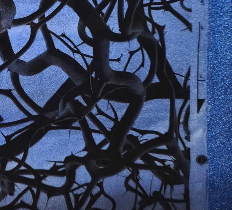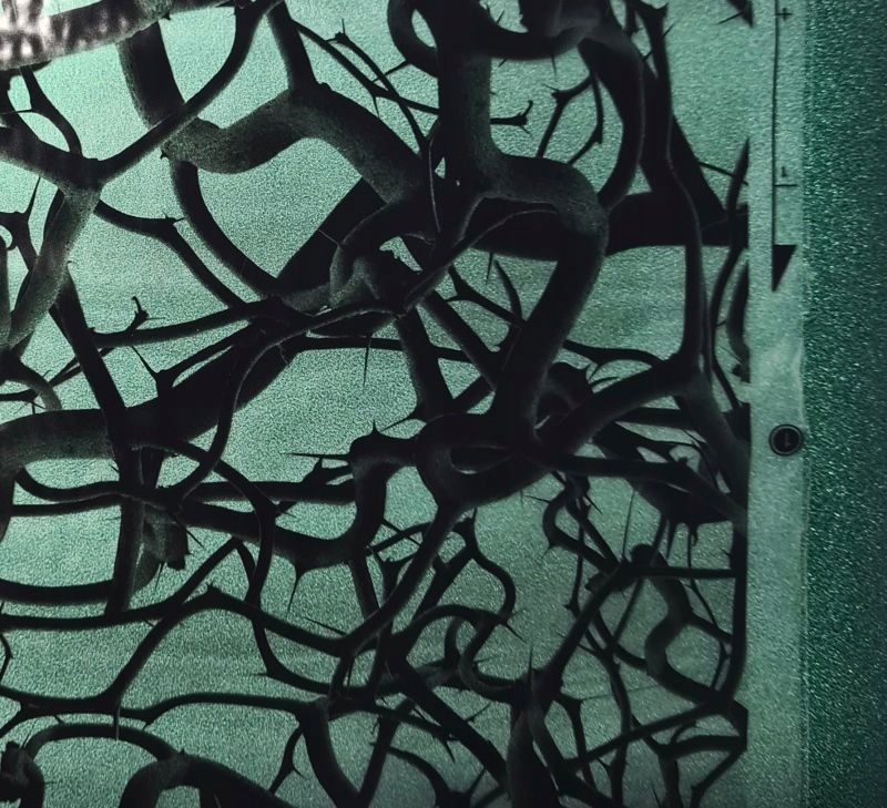 зображує кущі терну, що піднімаються в різних напрямках. Графіка виконана в темних тонах, що надає їй дещо темний характер. Колючий мотив, використаний на фользі, добре підійде як для декорування окремих елементів, наприклад, корпусу ноутбука, так і в автомобільній промисловості, напр. автомобільні диски. Можливість використання різних кольорів фону. Деякі варіанти представлені на фото.