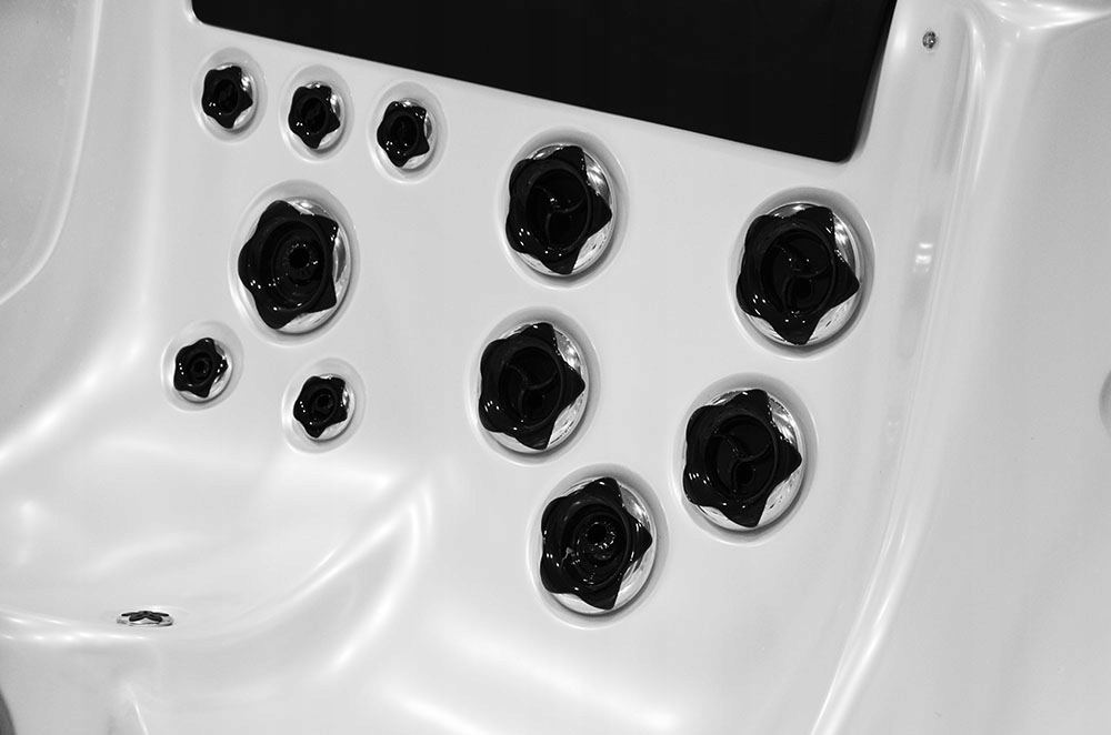 Форсунки у ванні покриті хромом. Вам не потрібно хвилюватися, що ці насадки покриються накипом. Кожна водяна форсунка має функцію аерації, яка передбачає додавання повітря у водну систему, що збільшує потужність водного масажу. Аерацію можна плавно регулювати за допомогою ручки.