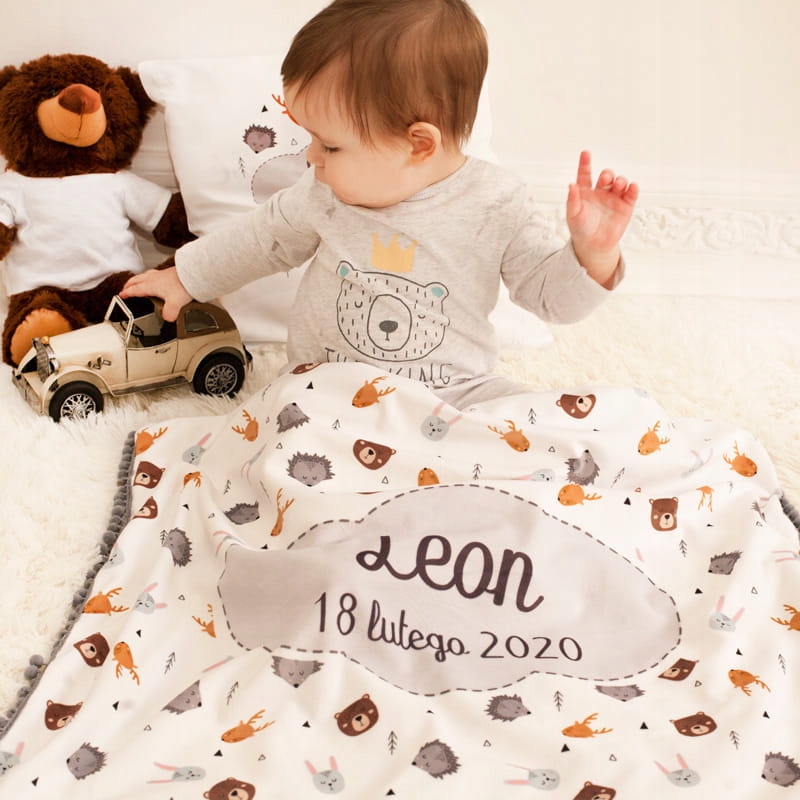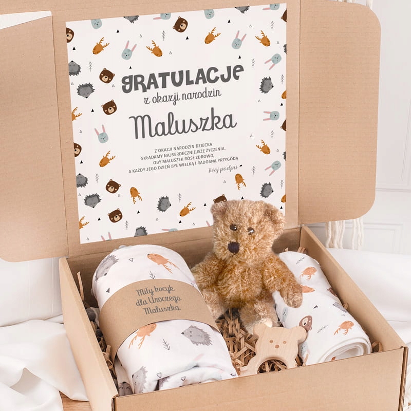 Який подарунок для новонародженого порадує батьків і залишиться унікальним сувеніром на довгі роки? Персоналізований подарунковий набір, упакований в екологічну крафтову коробку, виглядає красиво і дуже практично. Він складається, серед іншого, з: з м'якою іграшкою, дерев'яним прорізувачем, ковдрою з ім'ям та датою народження та рушником з ім'ям. Ці індивідуальні аксесуари - оригінальні та неповторні подарунки для вашої дитини. На кришці коробки також красива листівка з побажаннями та написом «Вітаємо з народженням малюка» та підписом дарувальника.