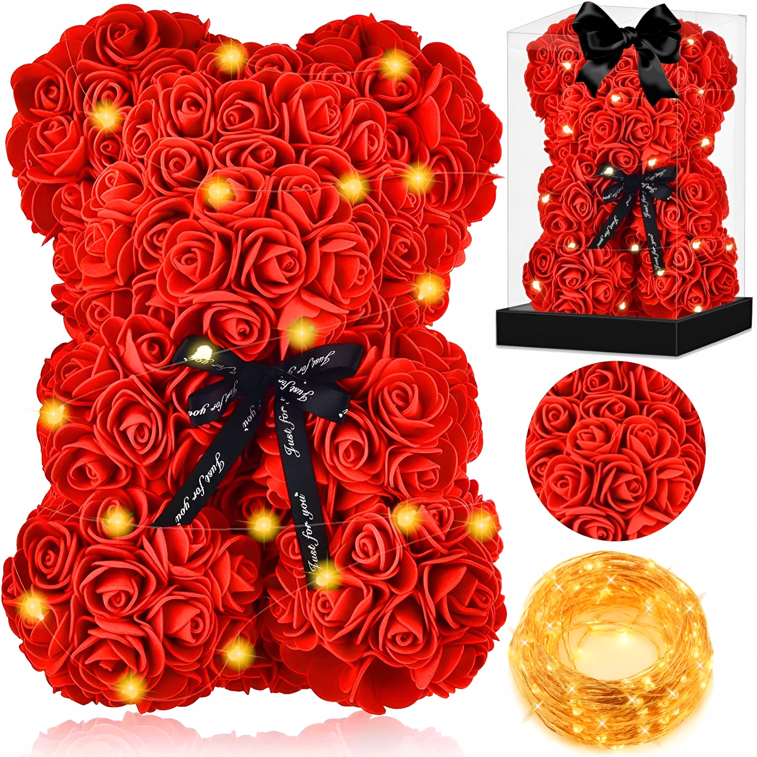 Плюшевий ведмедик із троянд — ідеальний подарунок для кожної жінки. Він виготовлений із близько 600 троянди , які скомпоновані у формі милого ведмедика. Композиція стане прекрасною прикрасою будь-якого інтер'єру. Плюшевий ведмедик оснащений світлодіодними лампами, які зроблять прикрасу ще більш унікальною. Троянди ніколи не зів'януть, тому вони ще довго будуть нагадувати про чудовий день, в який вони були подаровані.