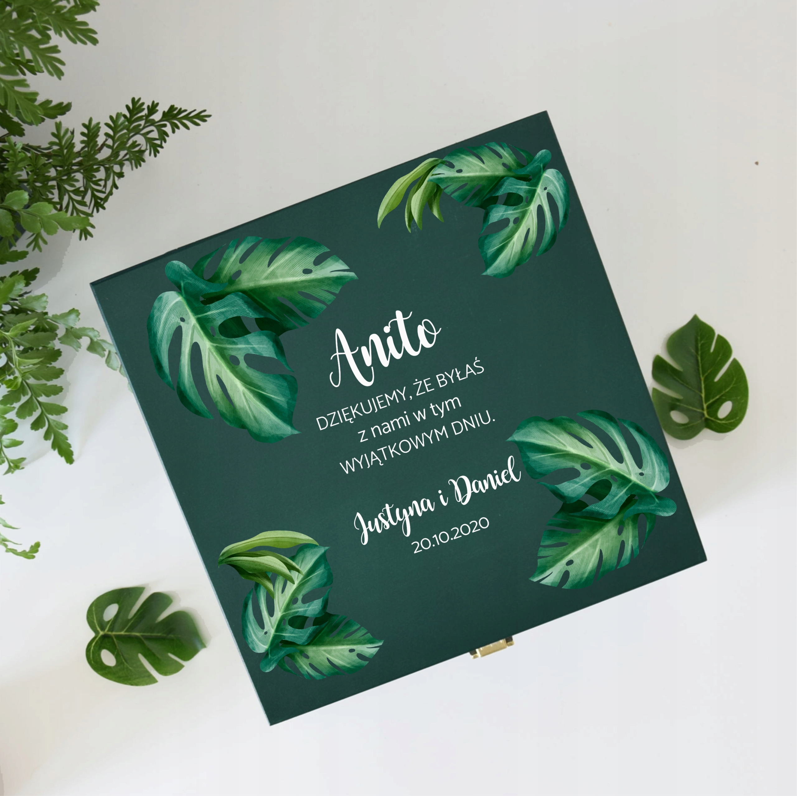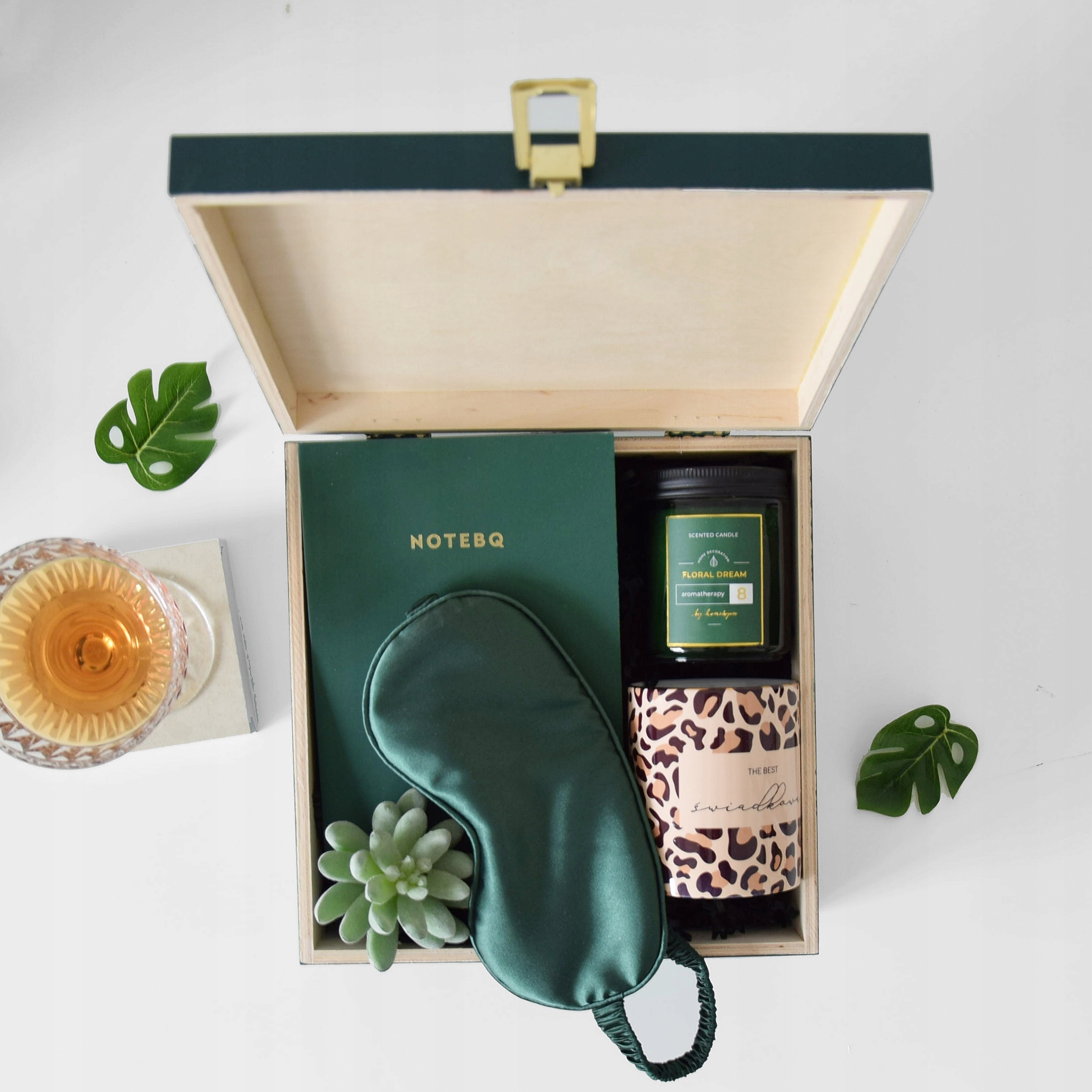 Все красиво виглядає в дерев'яна коробка пляшково-зеленого кольору.