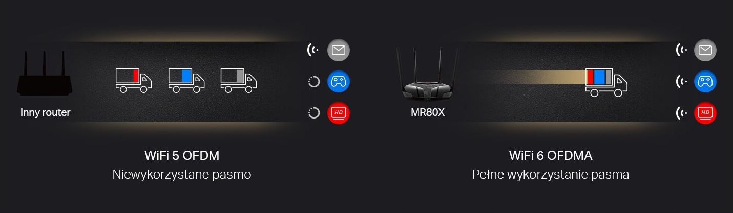Потокове передавання та ігри на кількох пристроях — це весело, не жертвуючи продуктивністю. MR80X підтримує OFDMA та MU-MIMO1, таким чином розширюючи можливості вашого Wi-Fi, дозволяючи передавати дані на декілька клієнтських пристроїв одночасно.