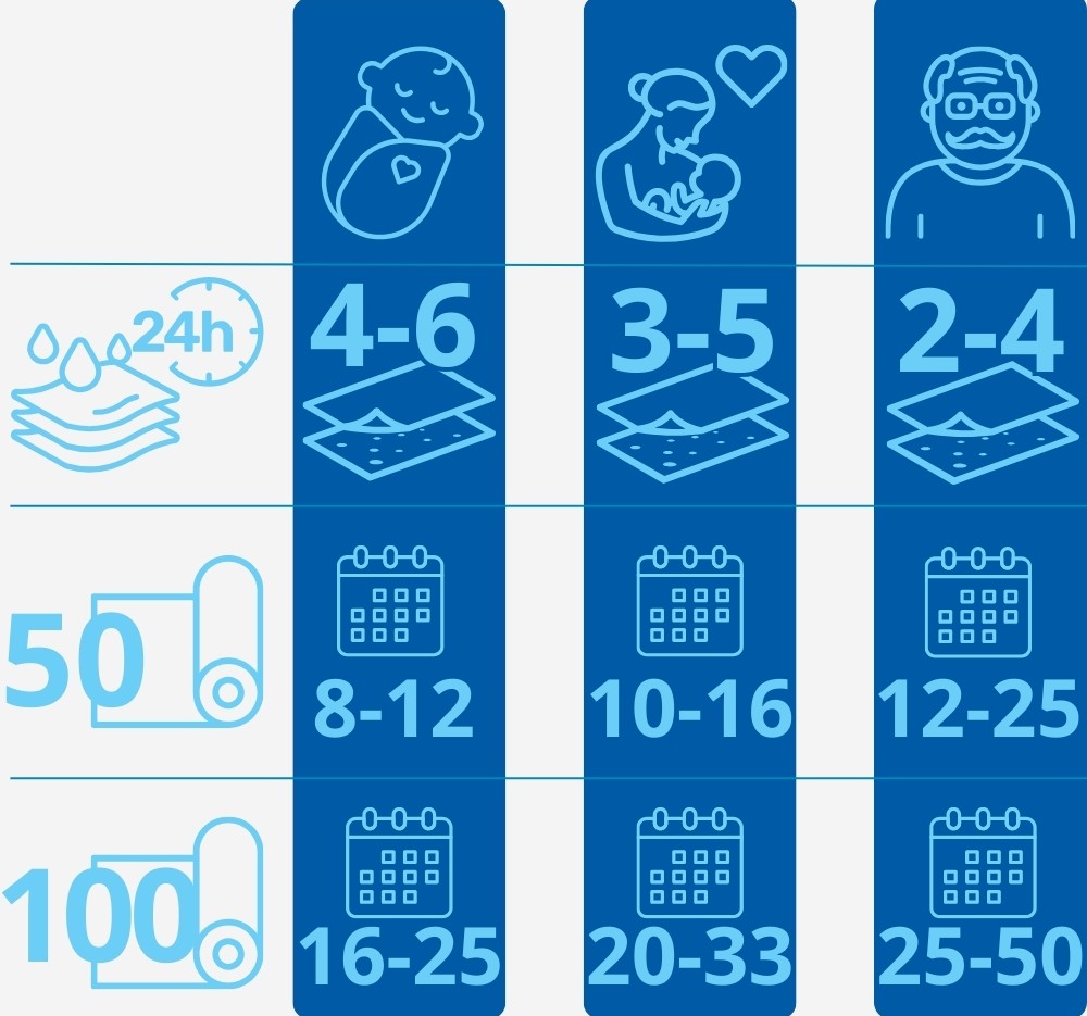 Вони не займають багато місця, їх легко зберігають і швидко замінюють. Хоча тонкі, вони ефективно зупиняють вологу і забезпечують повний захист. Ідеально підходить для змінного столу, для зручної сумки або поїздок. Практичне рішення для кожного дня.