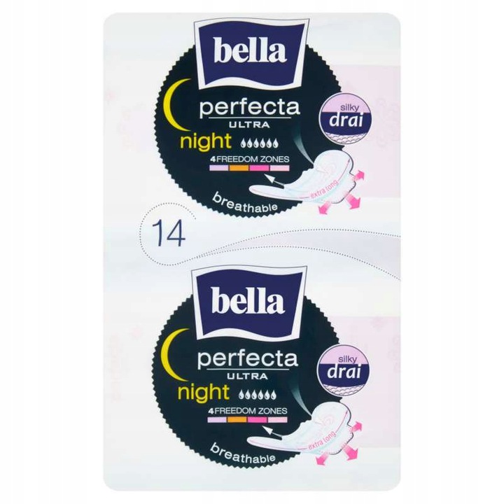 Ультратонкі гігієнічні прокладки Bella Perfecta Ultra, непомітні навіть на дуже тісному одязі. Покрита супервбираючою сіткою Silky Drai із системою мікролійок, яка швидко вбирає вологу та утримує її всередині подушечки, забезпечуючи високе відчуття поглинання. Рекомендується при дуже сильній кровотечі - вдень і вночі.